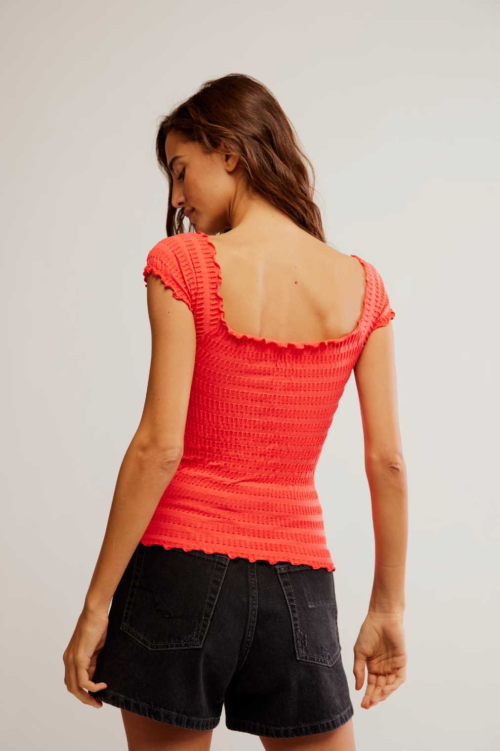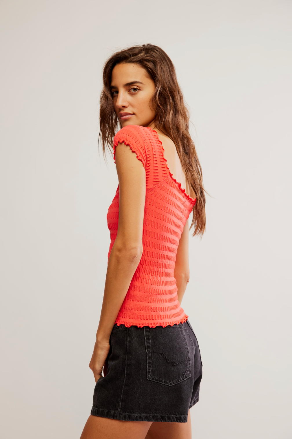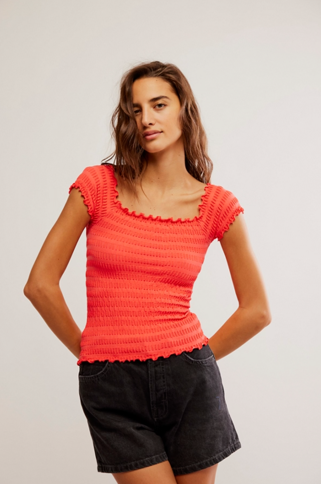 Features: Seamless fabrication, puckered texture, short sleeves, square neckline, lettuce edge trim