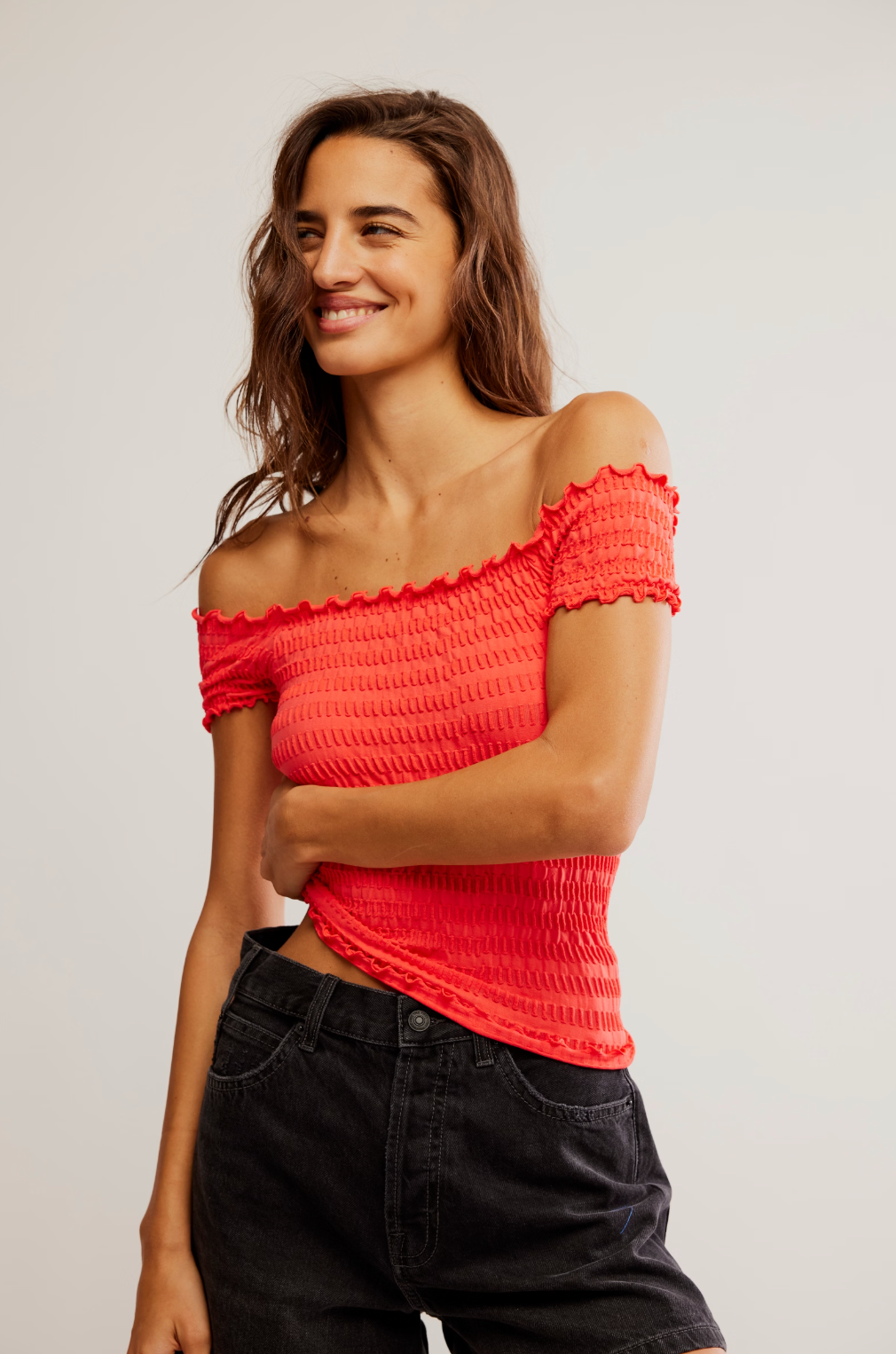 Our favorite seamless fabrication gets a textured touch with this ruched tee from Intimately. Can be worn on or off the shoulders!