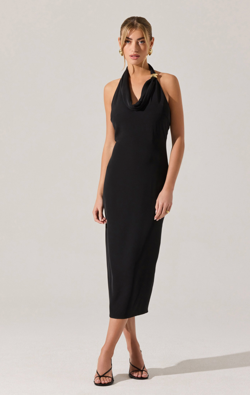 Sultry yet sophisticated, this halter midi dress is your go-to for evenings that call for a little drama. With a fluid cowl neckline accented by gold hardware and a sleek silhouette that skims the body just right, this piece balances elegance with allure. The rich black fabric drapes beautifully, making every movement feel intentional.
