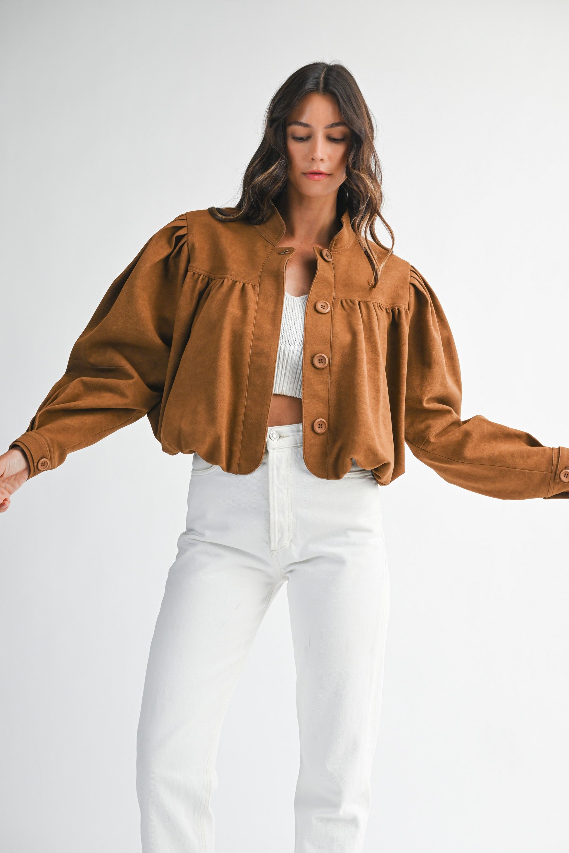 Designed for both comfort and style, this suede jacket features a cropped silhouette with a subtle bubble hem that adds volume and modern shape. The soft faux suede fabrication delivers a luxe look and feel, while the button-down front and lining make it an easy, wearable layer you’ll reach for again and again.