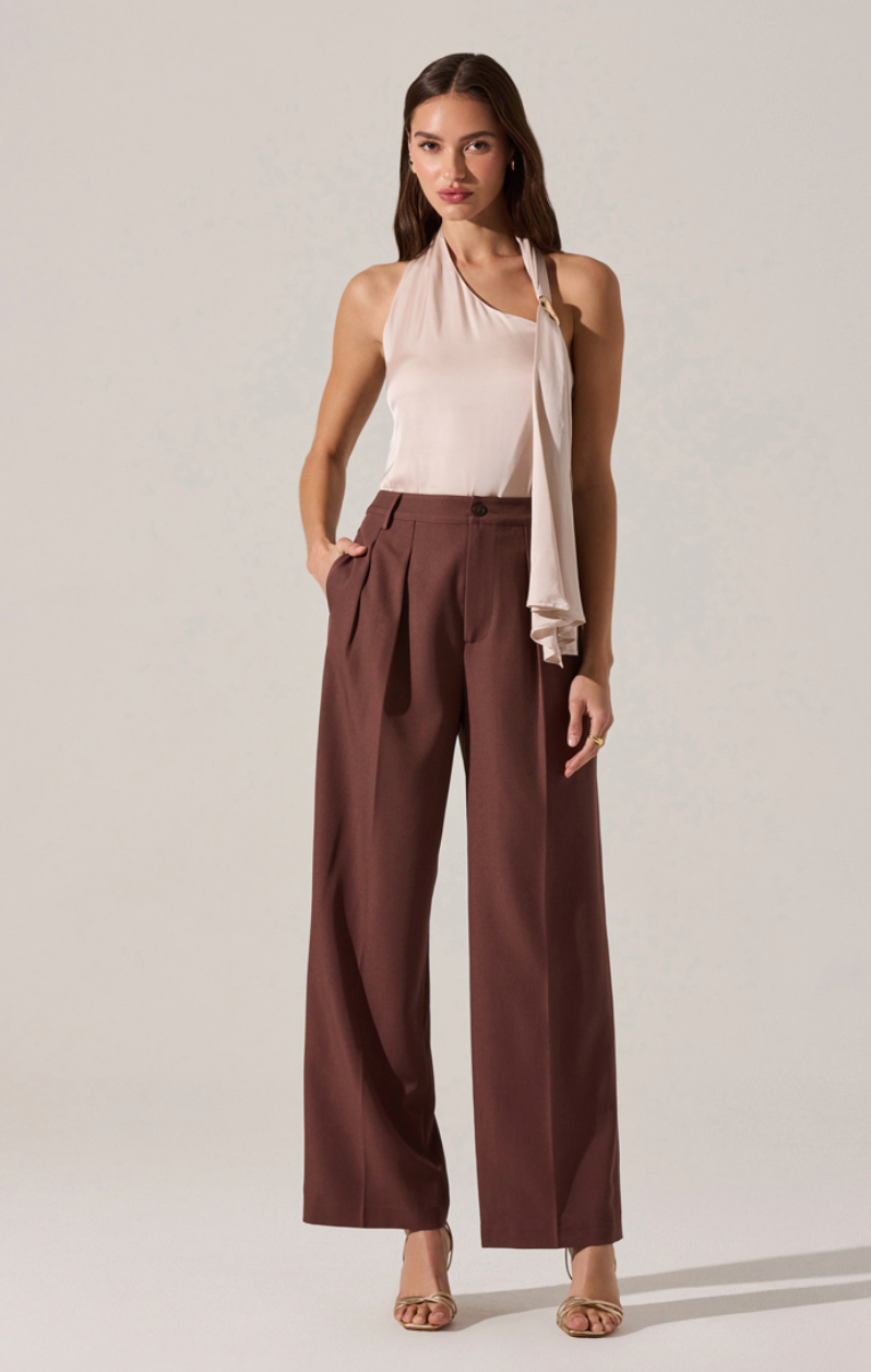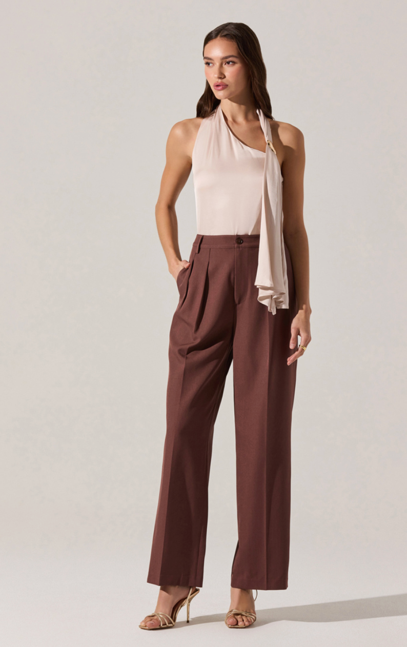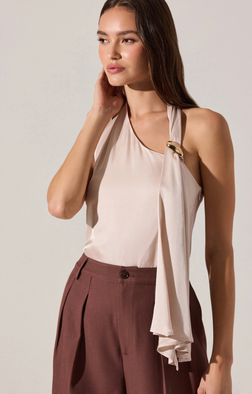 This sleeveless halter top brings effortless polish to any occasion. Designed in a sleek satin finish, it features a draped tie accent secured with a chic metal ring, adding just the right touch of detail. The open-back design balances sophistication with allure, making it perfect for both dressed-up evenings and stylish day looks.