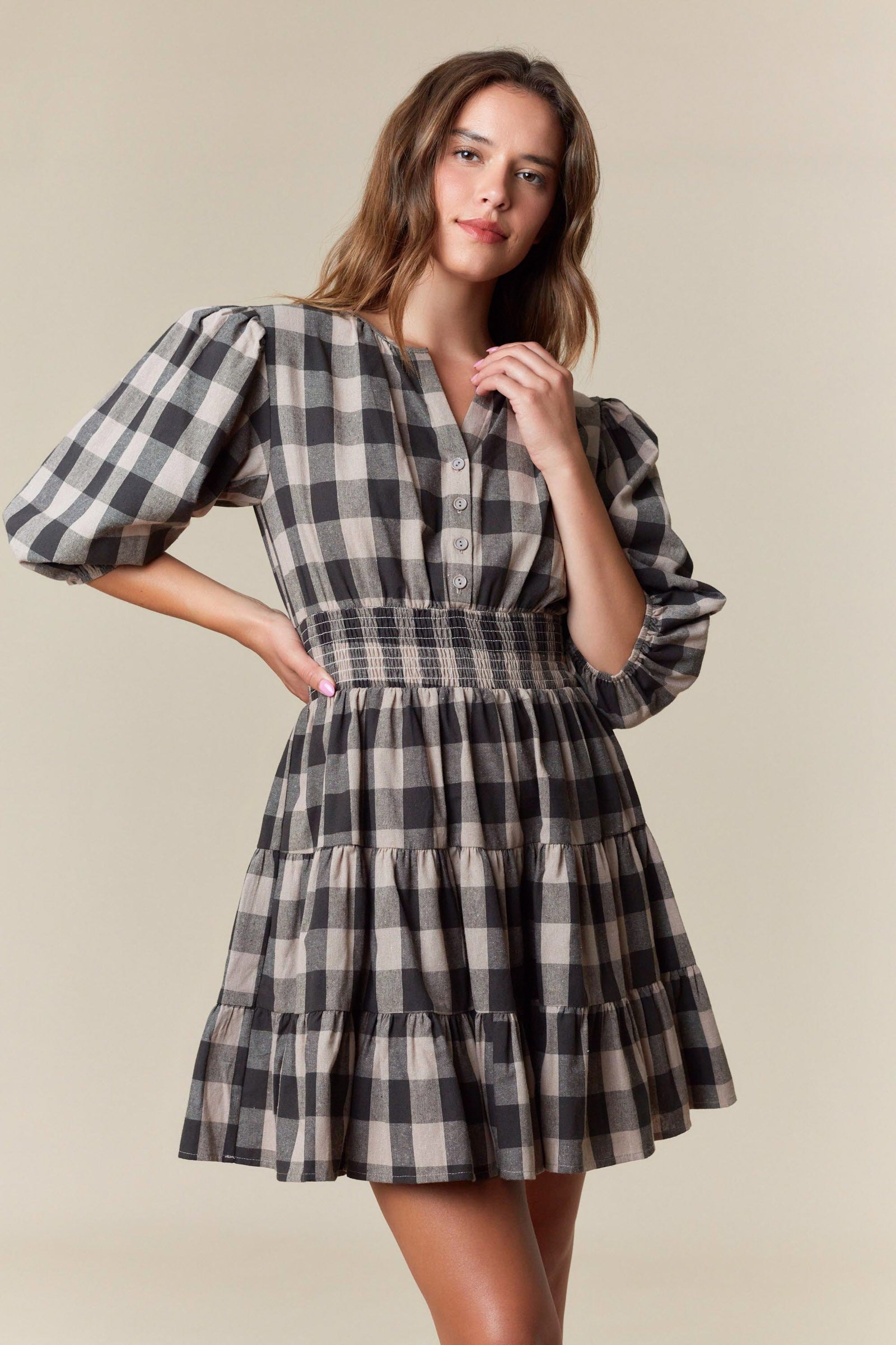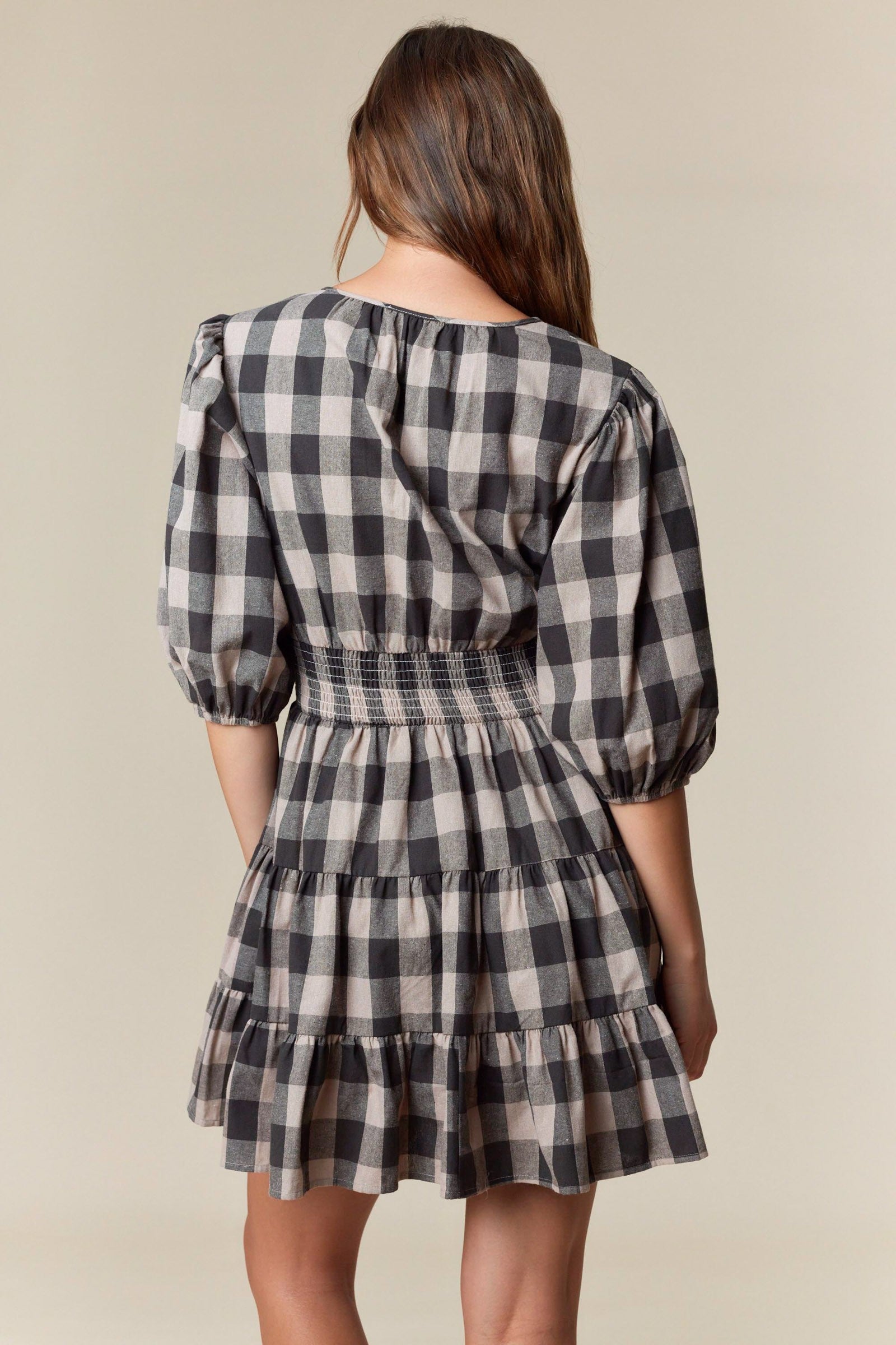 Designed for cozy charm and easy wear, this plaid mini dress features a smocked waist for a flattering, feminine shape. The soft 100% cotton fabrication feels light and breathable, while the tiered skirt and puff sleeves create an effortlessly classic silhouette. Perfect for everything from brunch to browsing fall markets.