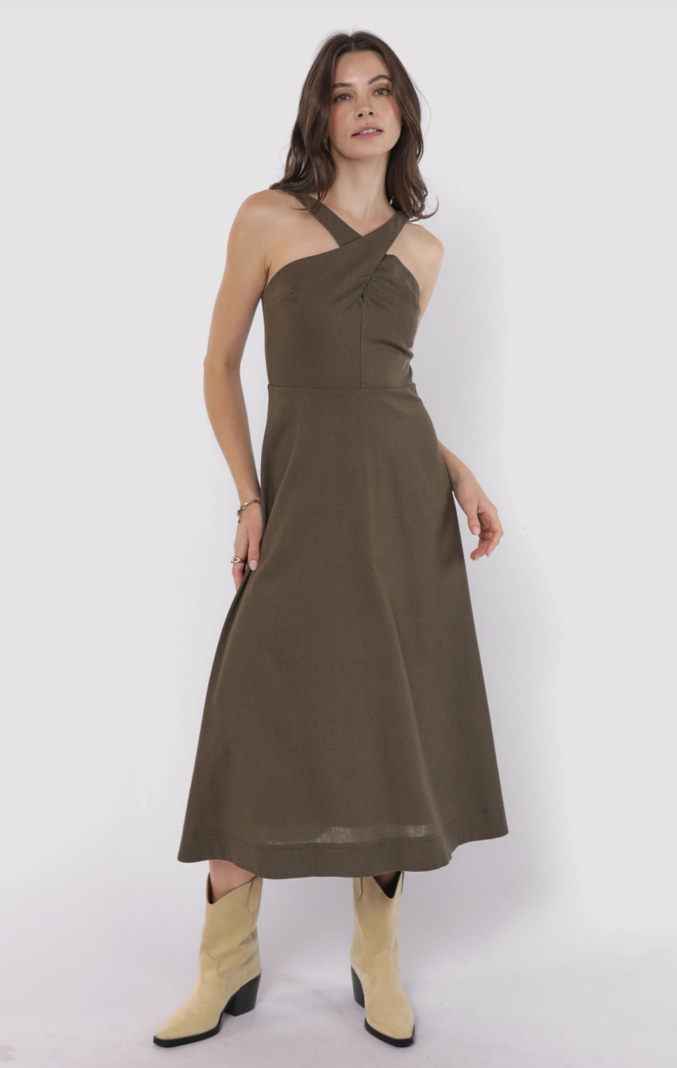 Linen blend midi dress with halter neck and smocked back/back zipper.