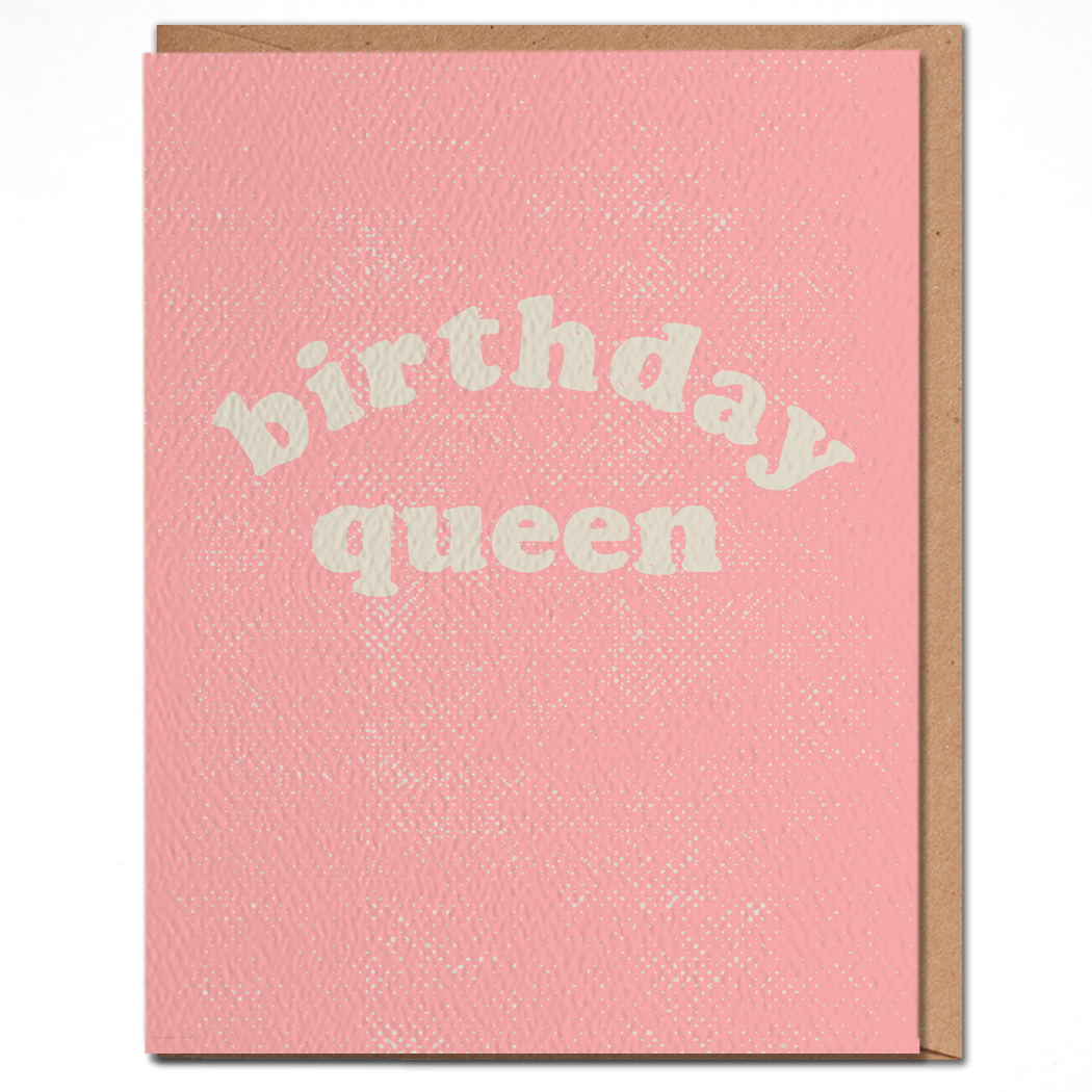 Natural felt textured card with 'birthday queen' graphic and blank inside. Card comes with a kraft envelope and is packed in a cello bag. Card measures 4.25" x 5.5".