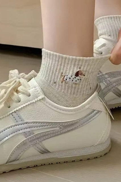 Bring a playful touch to your everyday look with these soft and breathable ankle socks, featuring a sweet embroidered dog and subtle dotted knit pattern. Designed for all-day comfort, they offer a cozy, lightweight feel that’s perfect for lounging or layering with sneakers and booties.