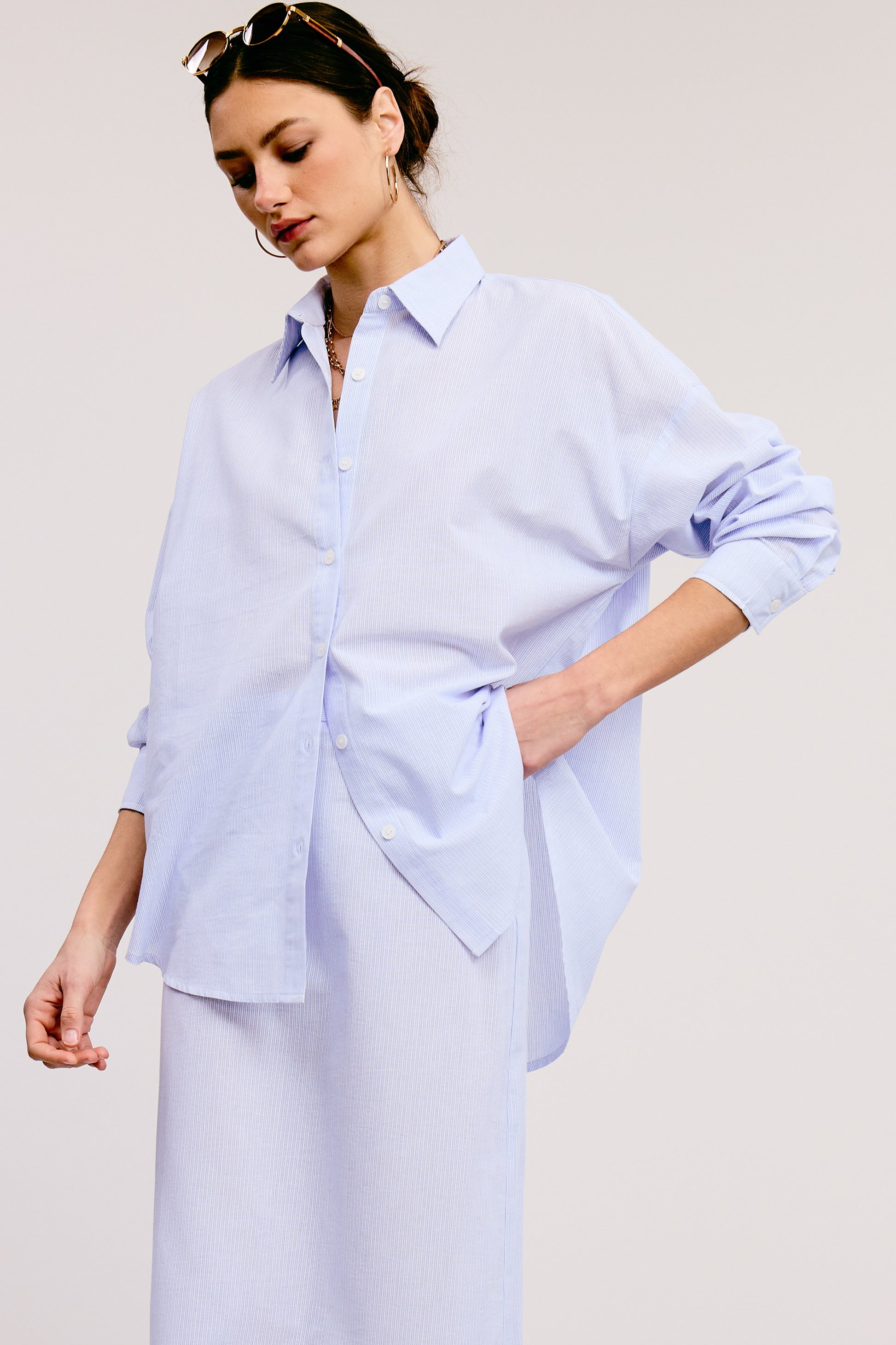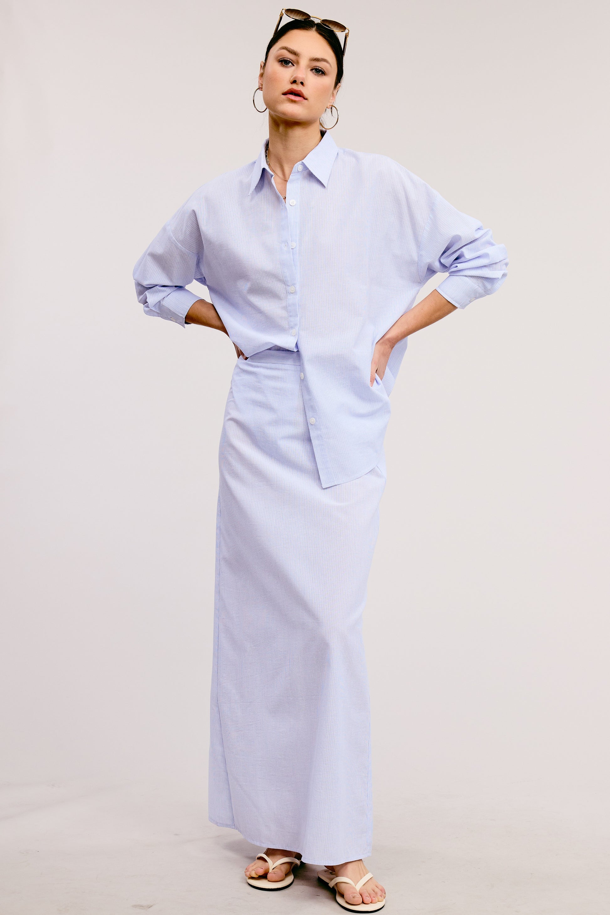 Elevate your office style with this timeless striped shirt and matching skirt set. The shirt features a classic button-down design with a collar and shirttail hem, while the high-waisted maxi skirt includes a side zipper closure and a back slit.