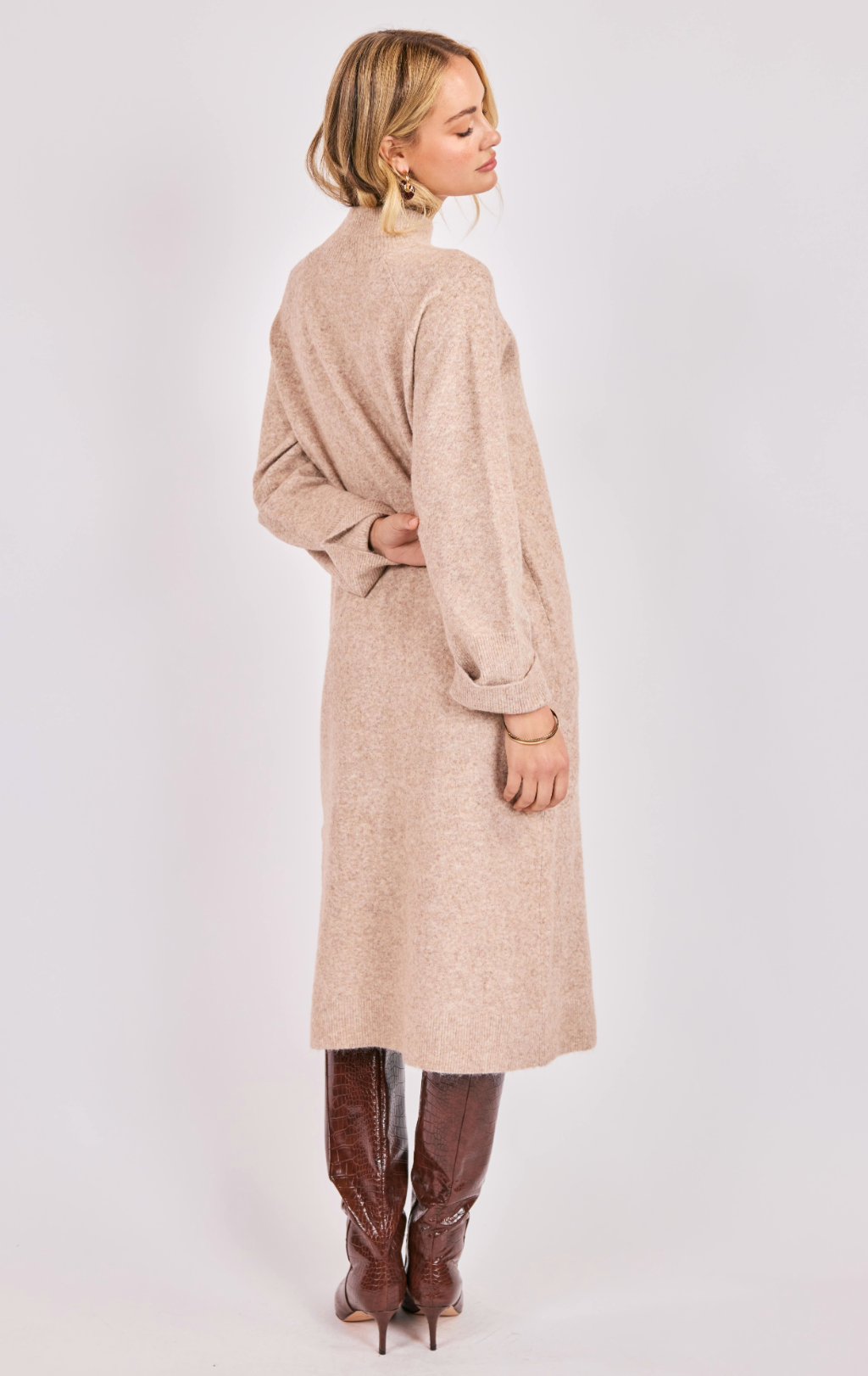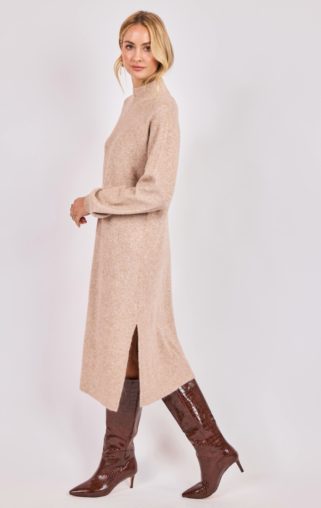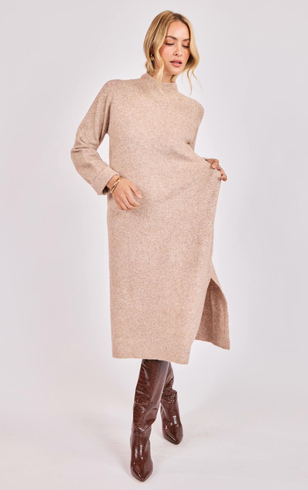 A timeless neutral made for cozy sophistication. The Hadley Turtleneck Midi Dress features a relaxed silhouette with long sleeves, a mock turtleneck, and soft, brushed knit fabric for that effortlessly elevated feel. Equal parts polished and comfortable, it’s a wardrobe staple you’ll reach for all season long.