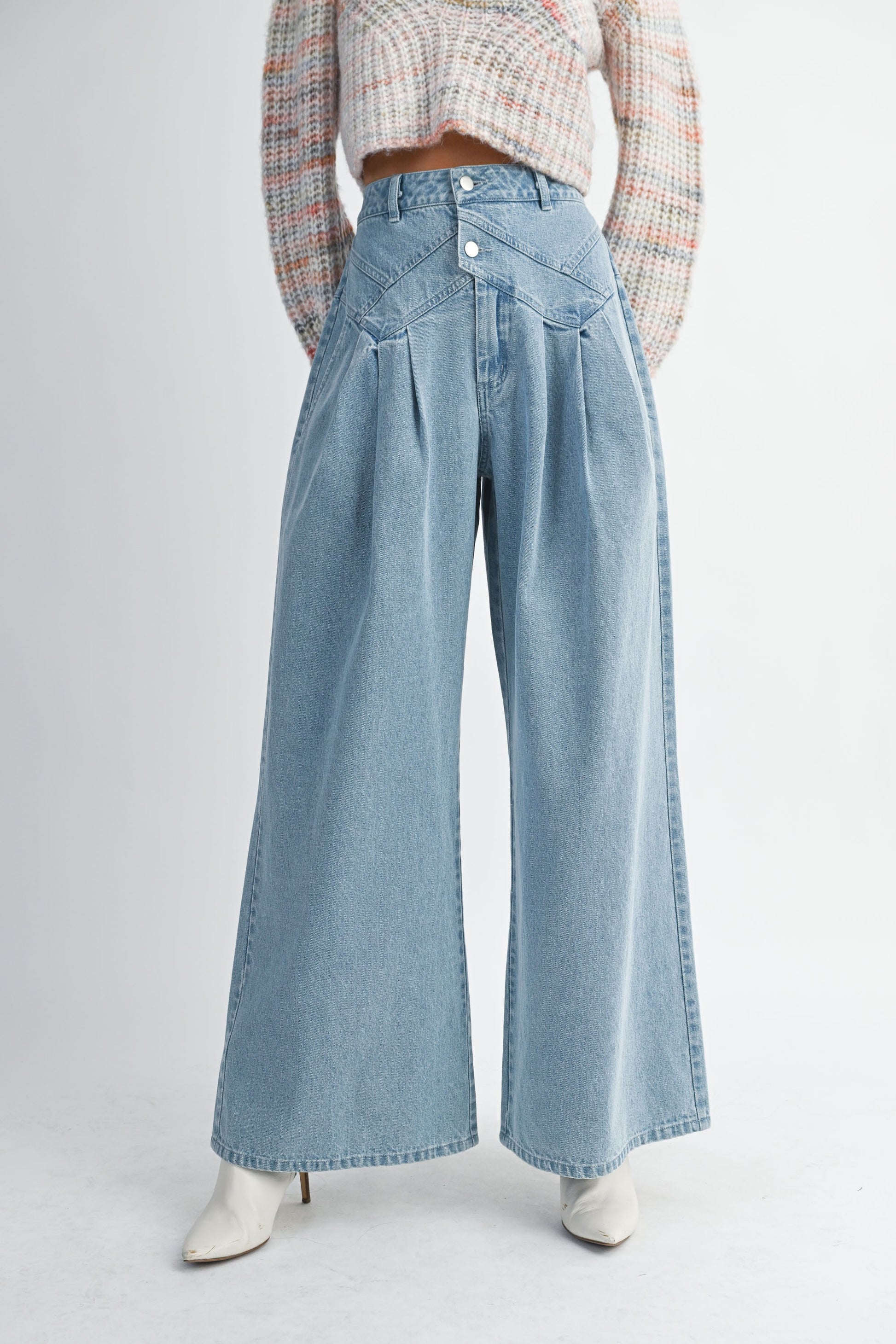 Designed for both comfort and style, these wide leg jeans feature a dramatic high rise and front pintuck detailing that elongates the silhouette beautifully. The double button closure adds a touch of polish, while the soft denim fabric drapes with effortless ease.