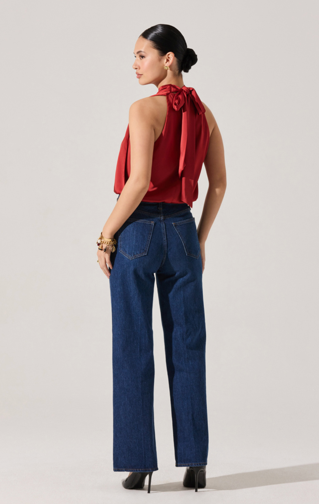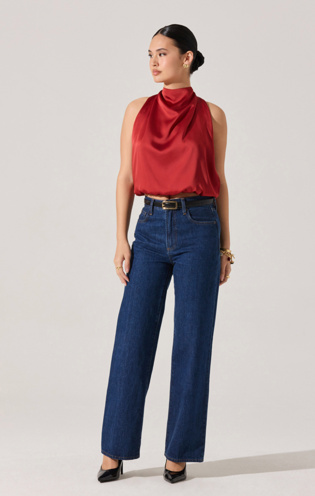 Wide-leg denim and heels for casual chic