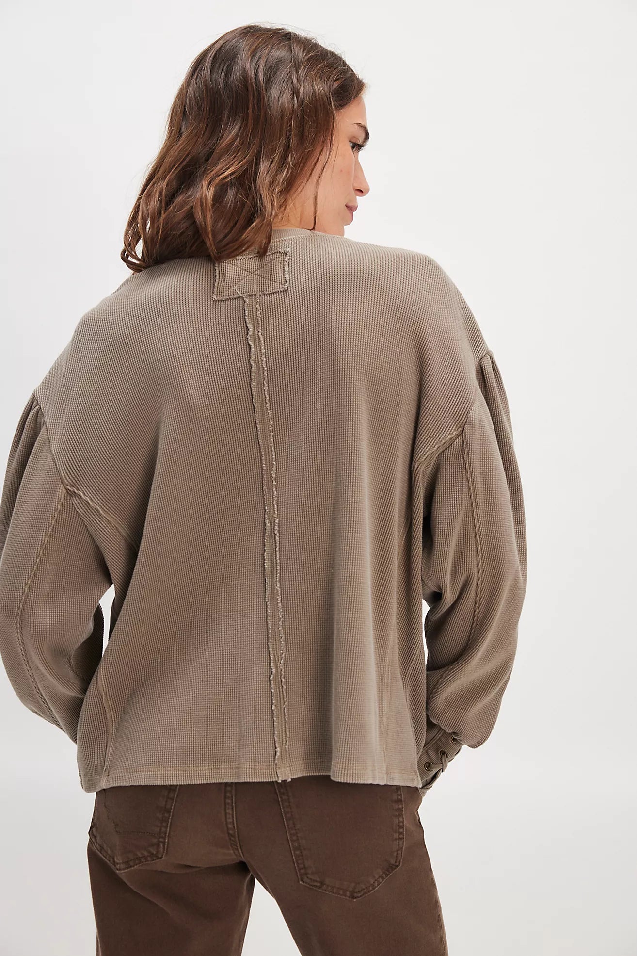 Designed for both comfort and style, this long sleeve top features a relaxed silhouette that drapes effortlessly over the body. The soft cotton waffle knit gives it a breathable, textured feel, while lace-up cuff detailing adds just the right touch of understated edge.