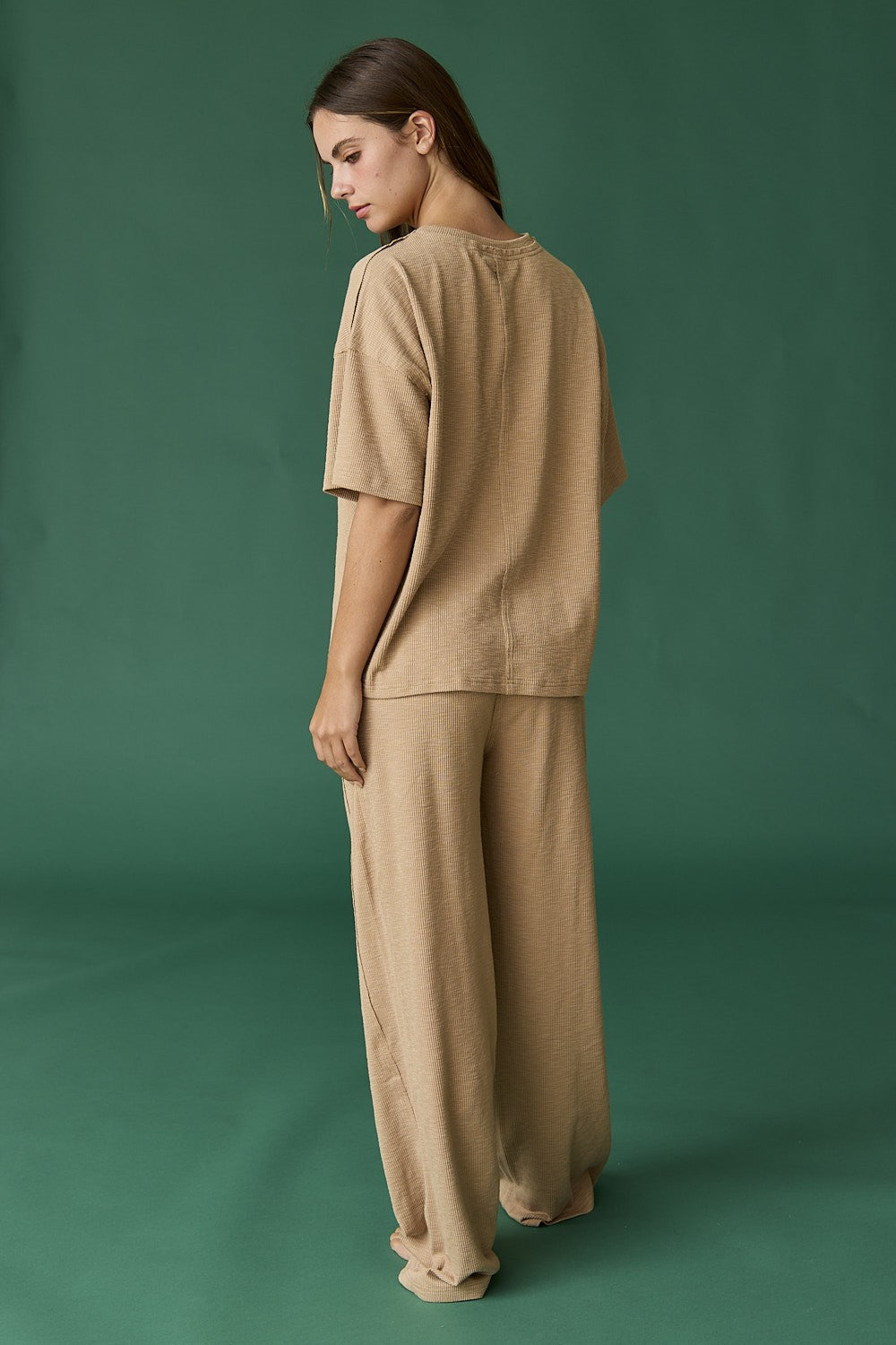 Cozy up or step out in this minimalist two-piece lounge set, complete with a loose-fitting top and flowy wide-leg pants. The soft textured knit drapes with ease and stretch, making it your go-to for everything from lazy mornings to airport runs.