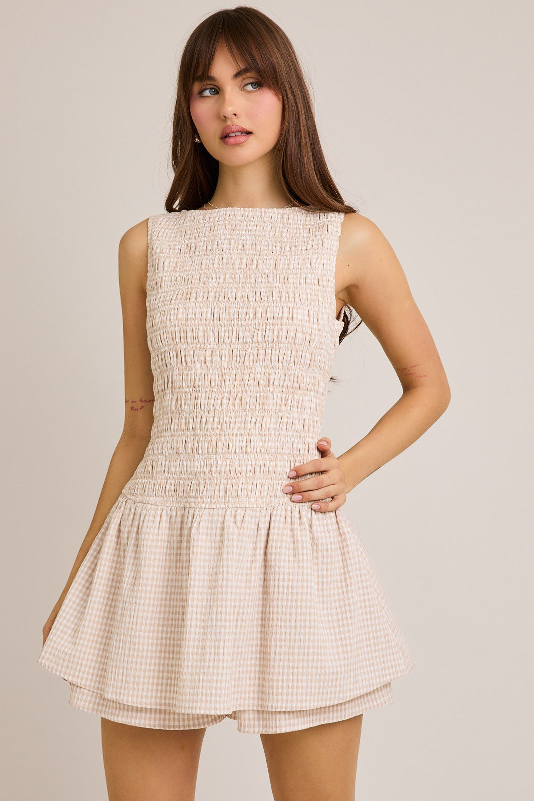 Boat neck romper with smocking bodice and low waist. Model is 5'8" wearing size small.