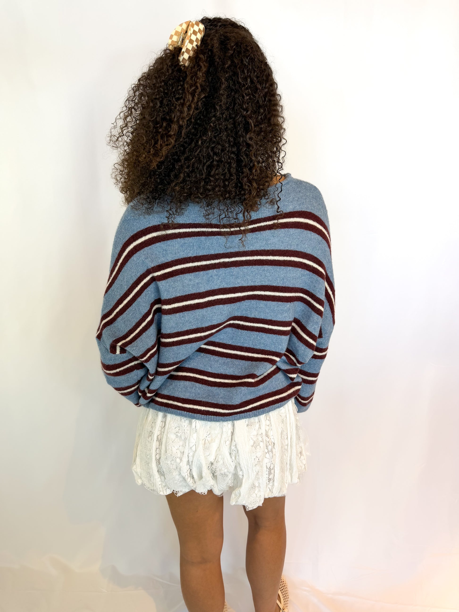 Designed for easy, feel-good wear, this striped cardigan blends classic varsity vibes with a relaxed, lived-in feel. Crafted from a soft, cozy knit, it features a button-front silhouette that layers effortlessly over tanks, tees, or dresses. The casual stripe pattern adds timeless appeal, making it a go-to piece for everyday moments—whether you’re out for a stroll or settling in for a laid-back afternoon.