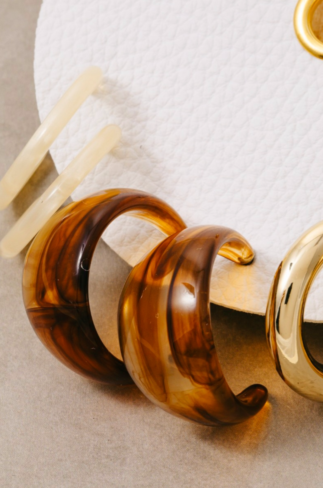 • Set includes 3 pairs of hoops: gold metallic, brown marble resin, and ivory resin