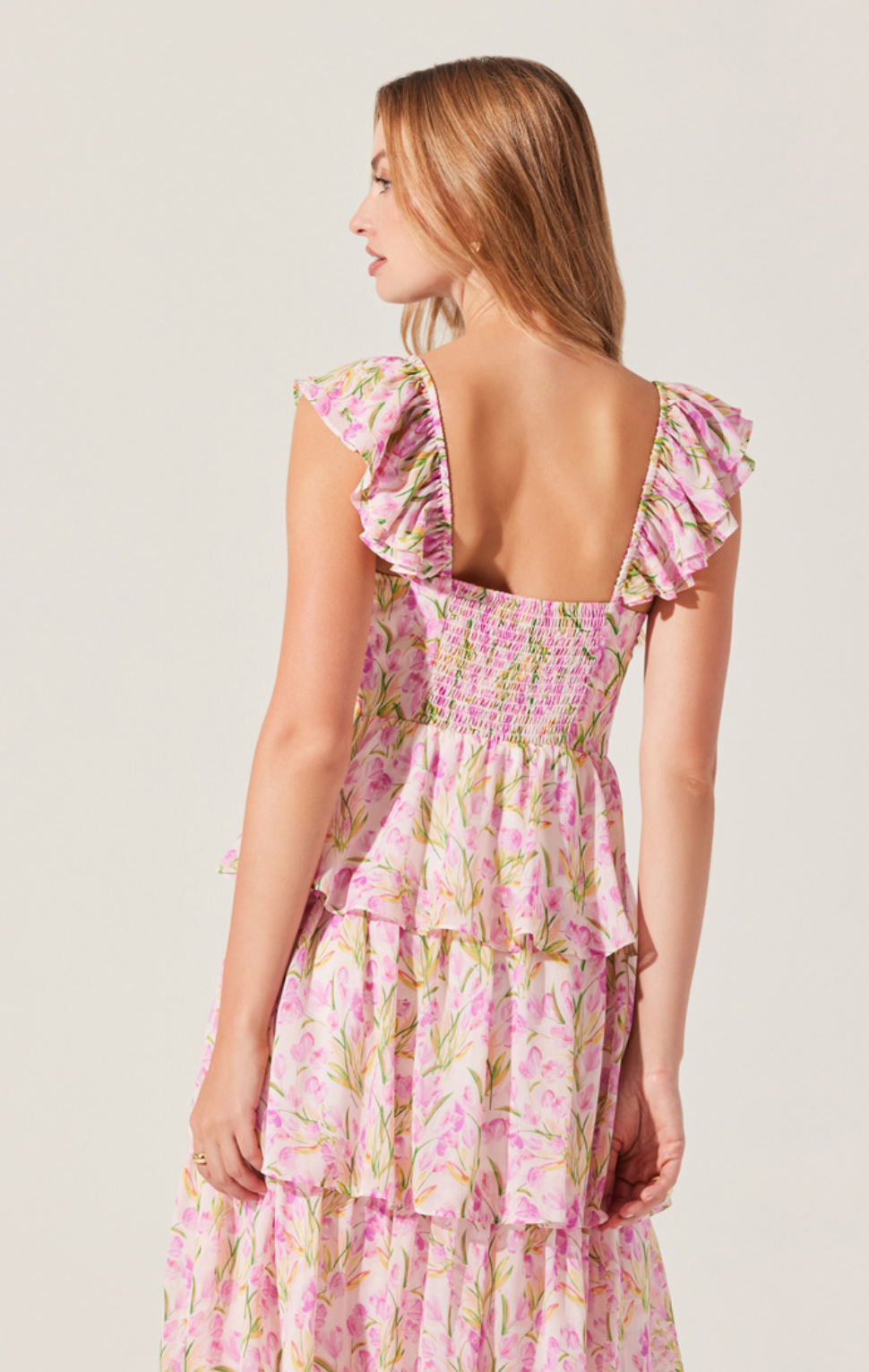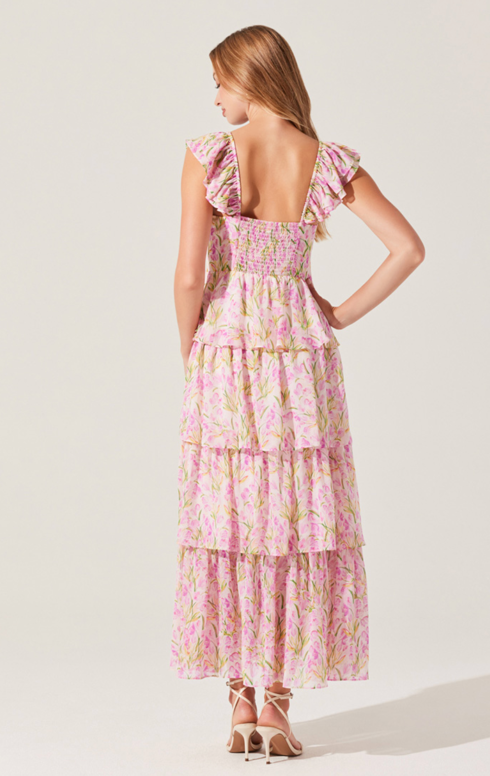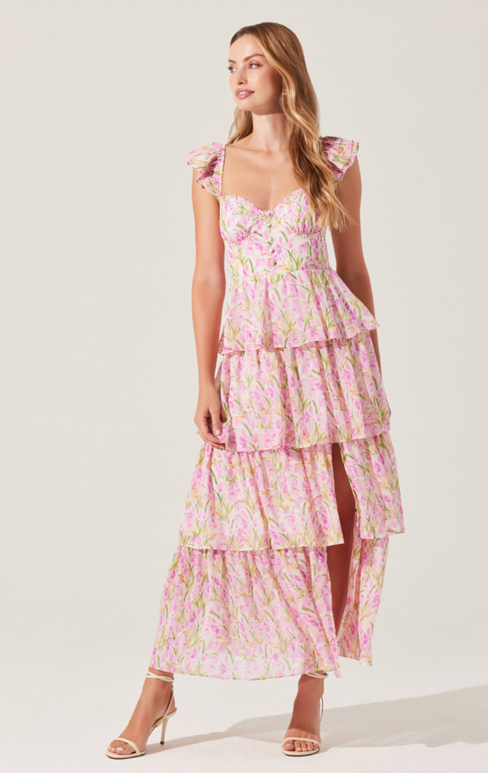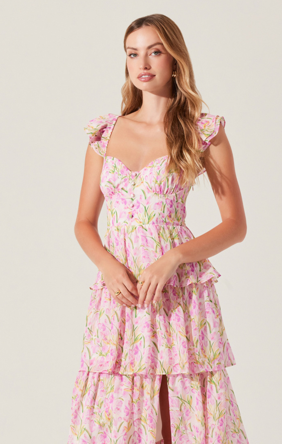 A stunning floral tiered maxi dress featuring button detail and front slit with smocked back for the best fit. Perfect for a spring wedding or baby shower!