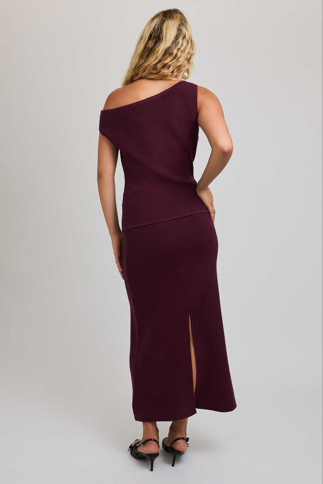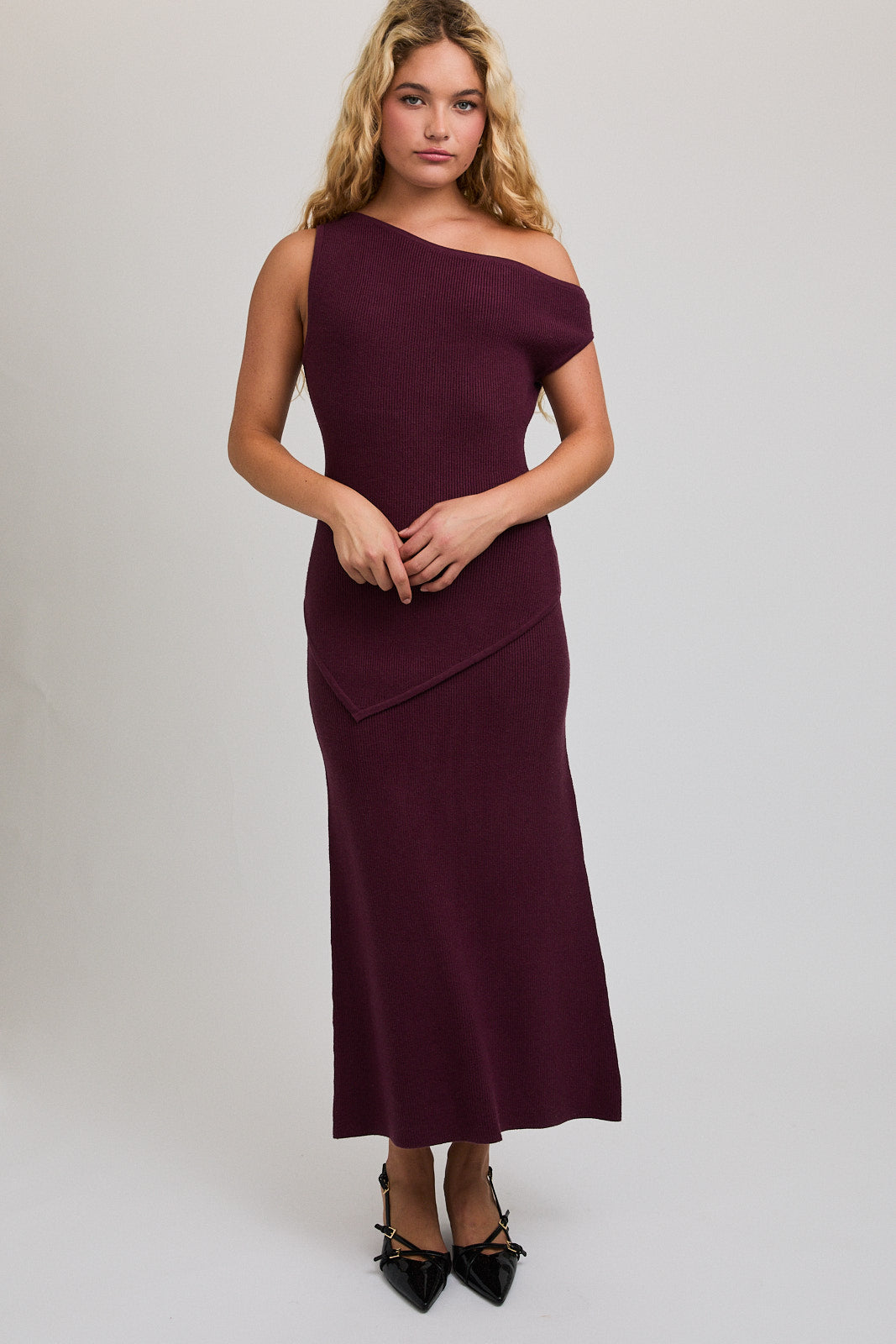 Two piece knit sweater set. Top features an off the shoulder cut with an asymmetric hem + skirt is fitted with a back slit. Model is in size small.