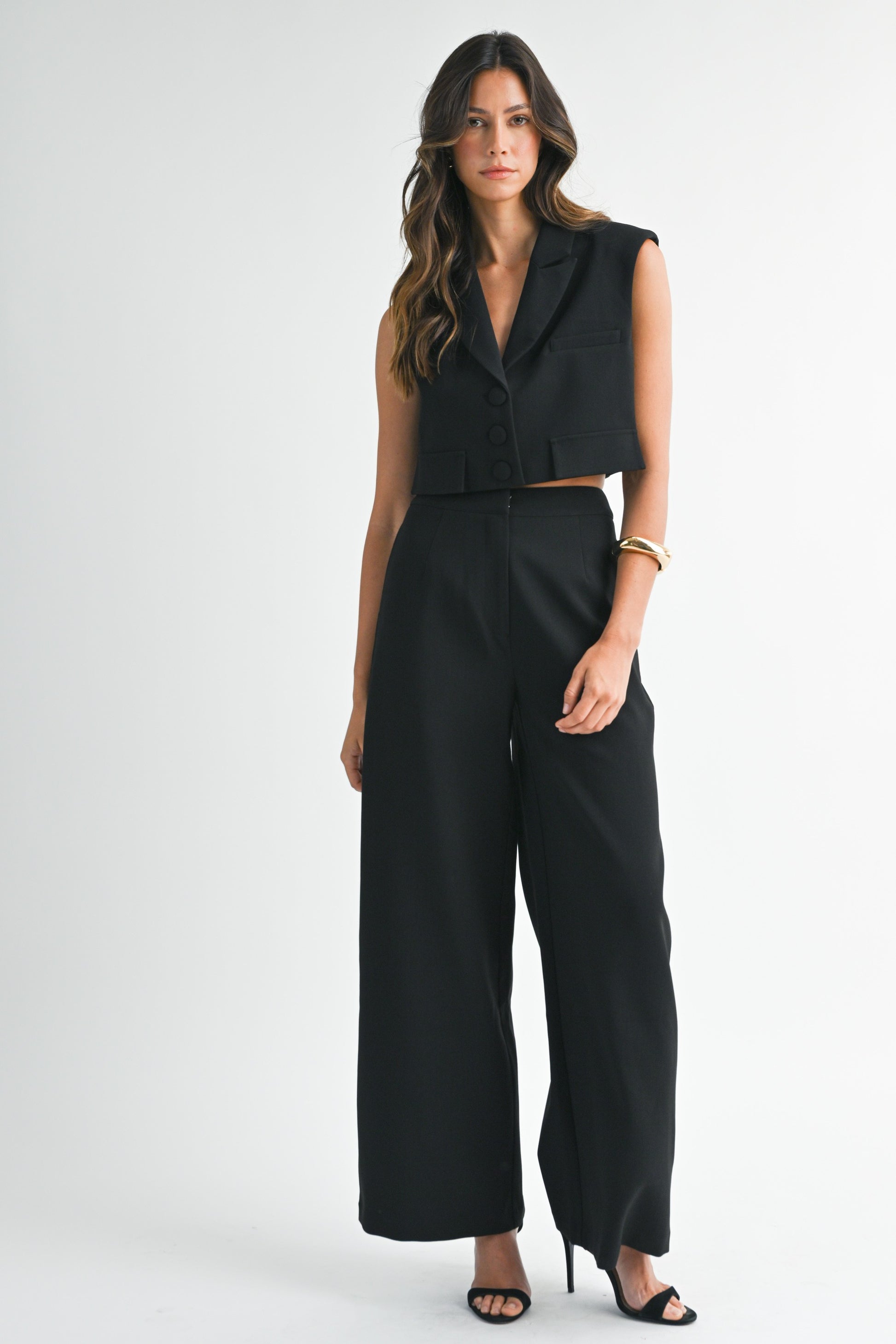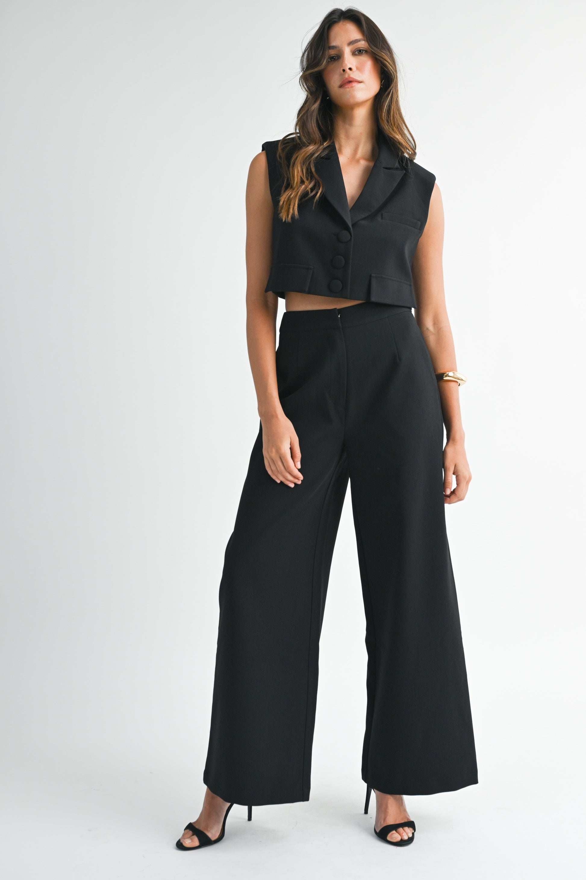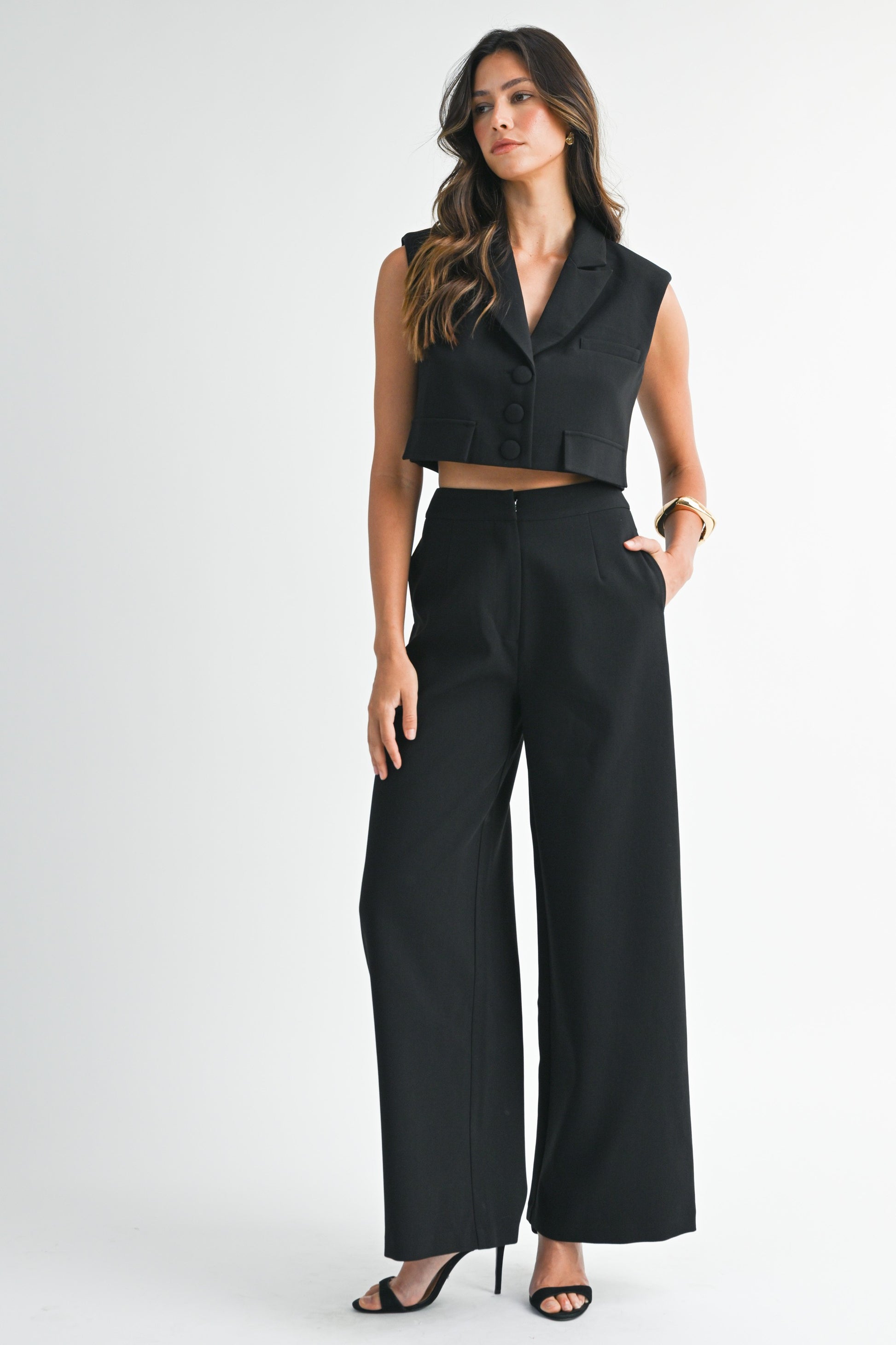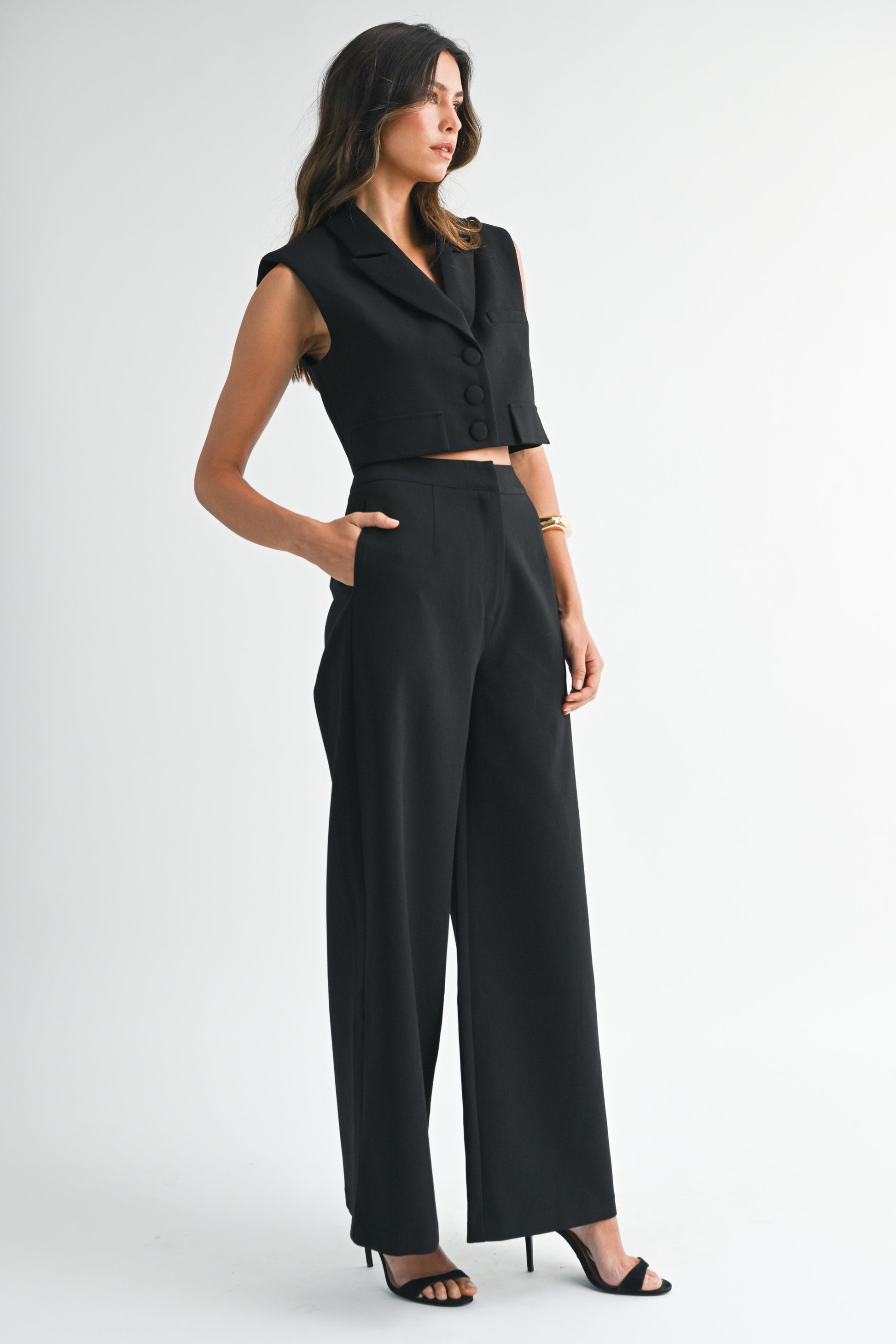 Tailored yet bold, this black vest and pant set delivers all the sharpness of a power suit with the cool confidence of modern design. The cropped vest features a structured collar, flap details, and covered buttons, while the high-waisted wide-leg pants balance it out with clean lines and a sleek side pocket finish. A soft stretch lining ensures all-day comfort.