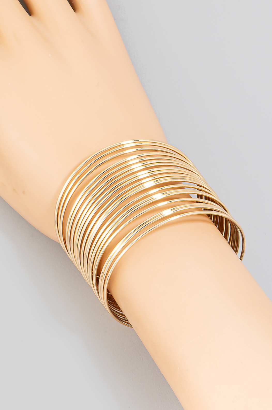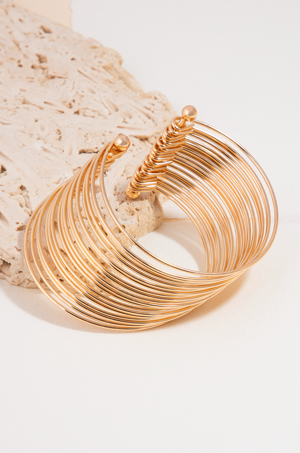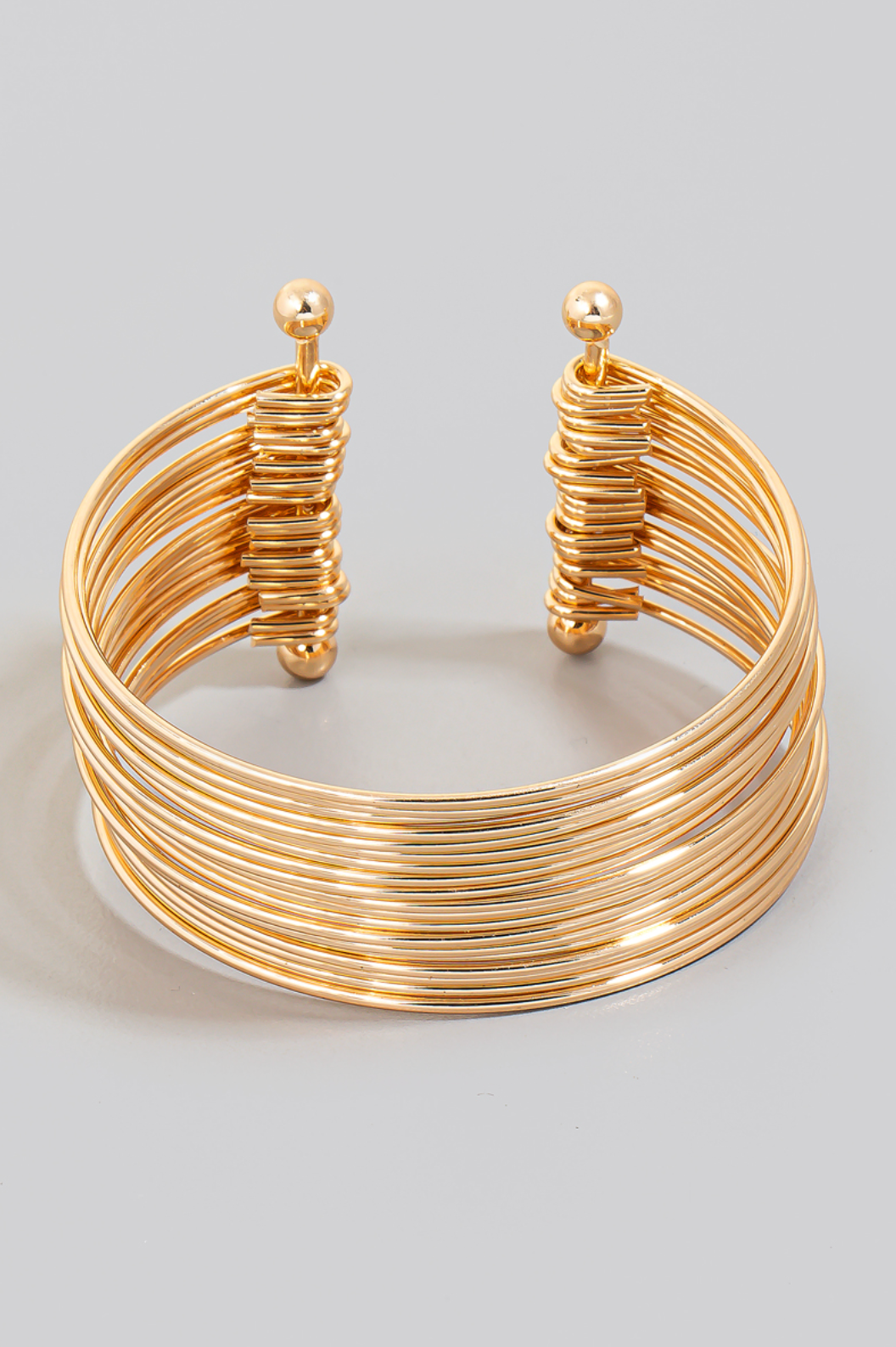 Layered metallic wire cuff bracelet.