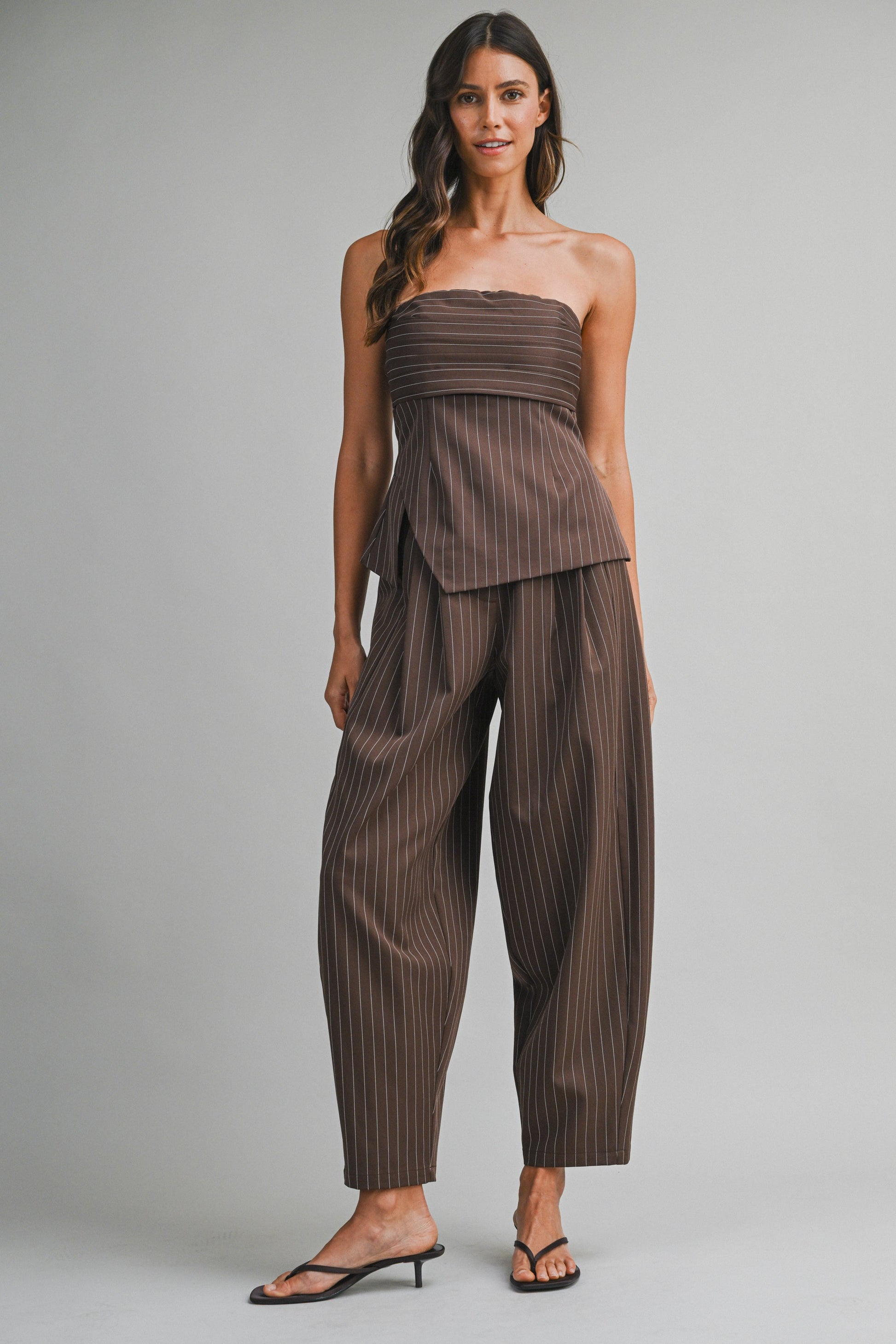 Designed for both statement style and wearability, this pinstripe two-piece set features a sleek strapless tube top paired with relaxed barrel-leg trousers for a perfectly balanced silhouette. The structured yet flexible fabric drapes cleanly, while thoughtful tailoring details give this set a polished, fashion-forward feel.