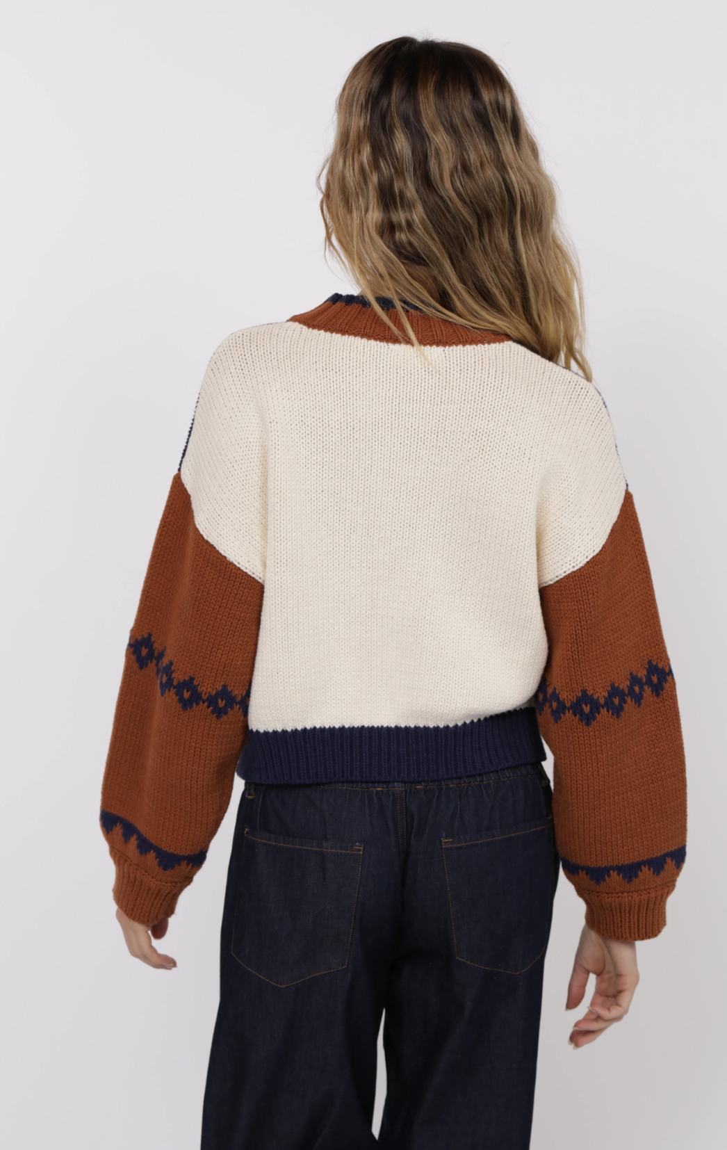 This zip-front sweater jacket blends classic jacquard florals with a modern colorblock palette of navy, cream, and warm rust. Crafted from a soft cotton-acrylic knit, it delivers warmth without bulk, making it perfect for layering through transitional seasons. The cropped silhouette, ribbed trims, and intricate pattern work give it that special, one-of-a-kind feel.