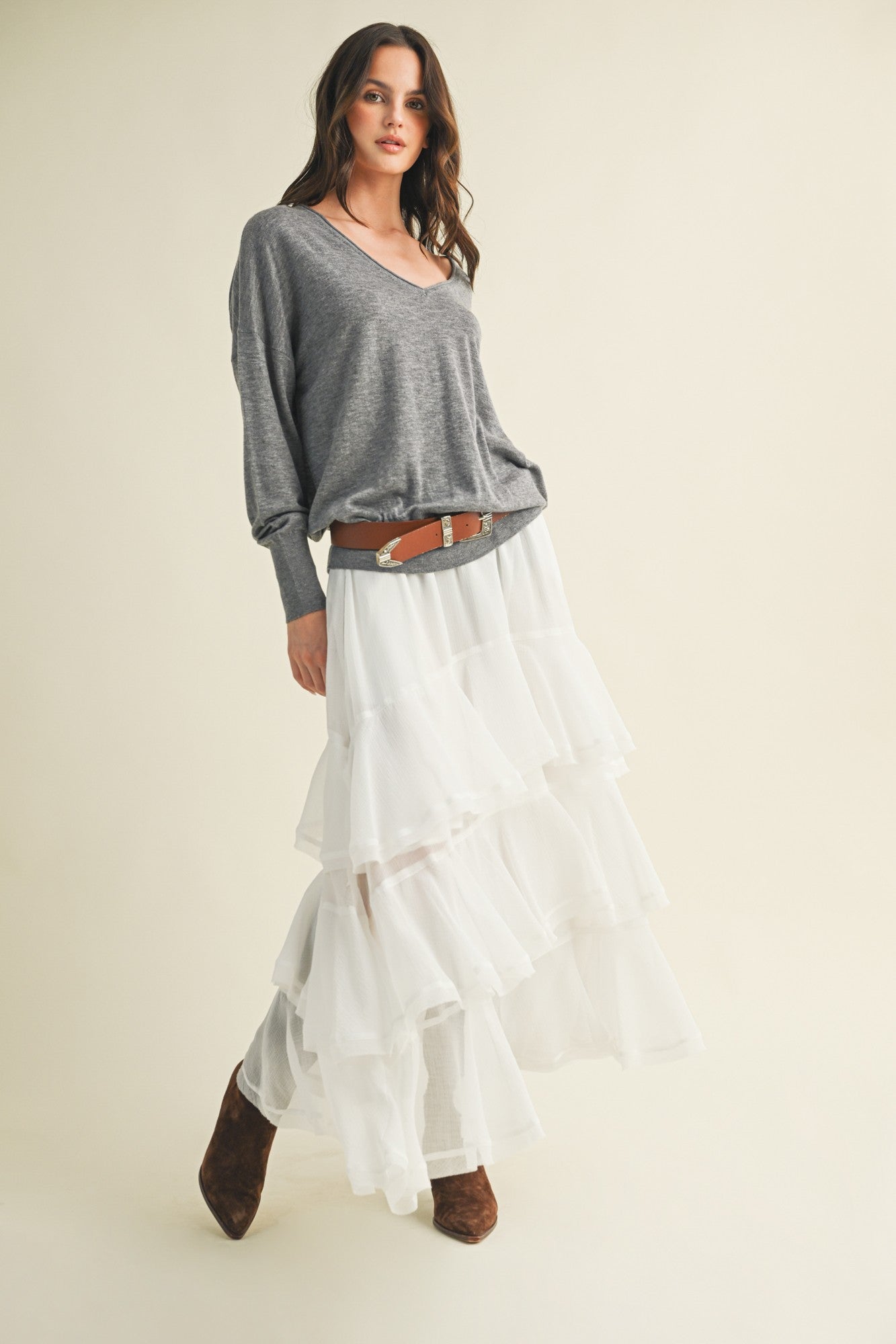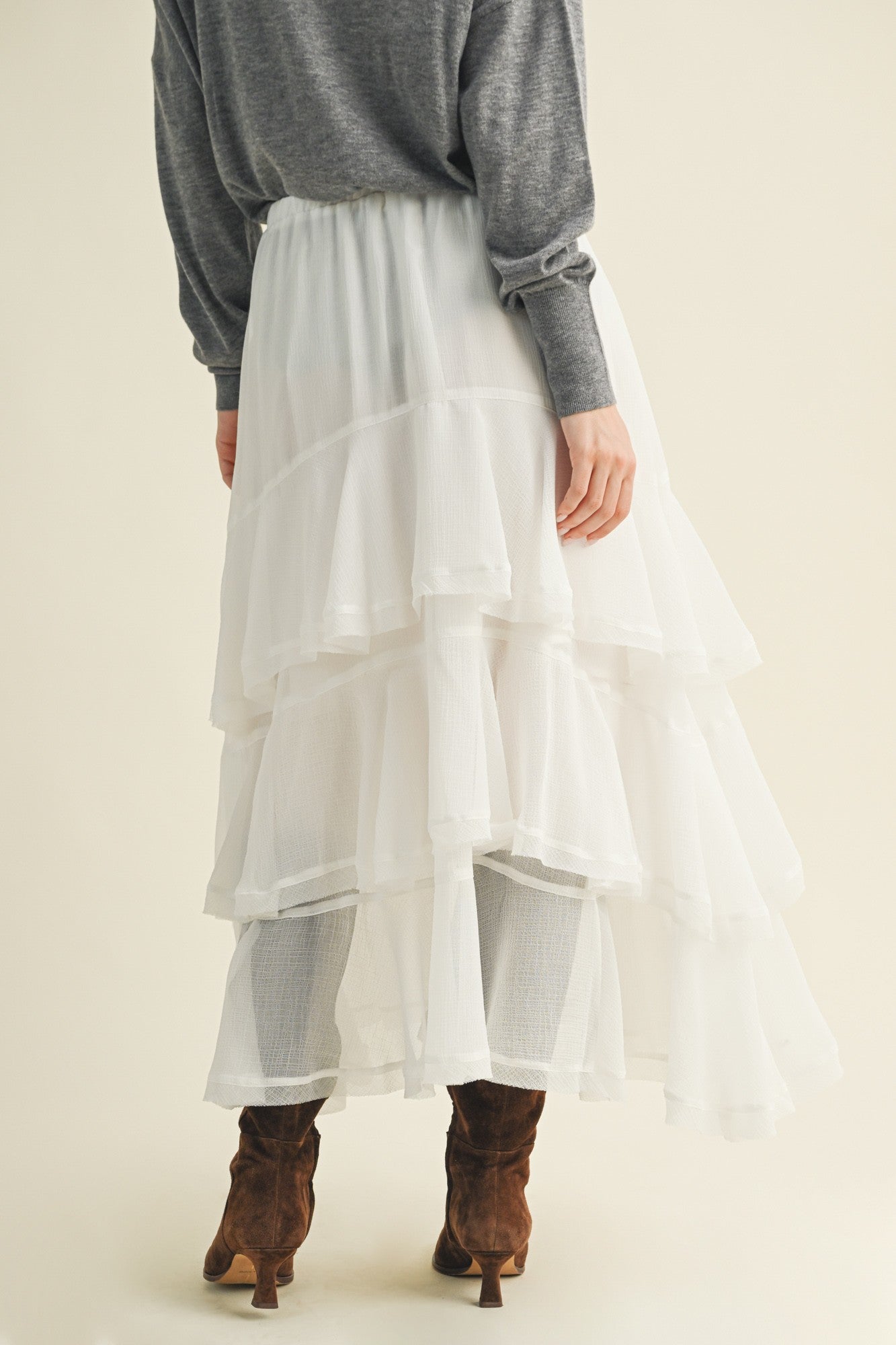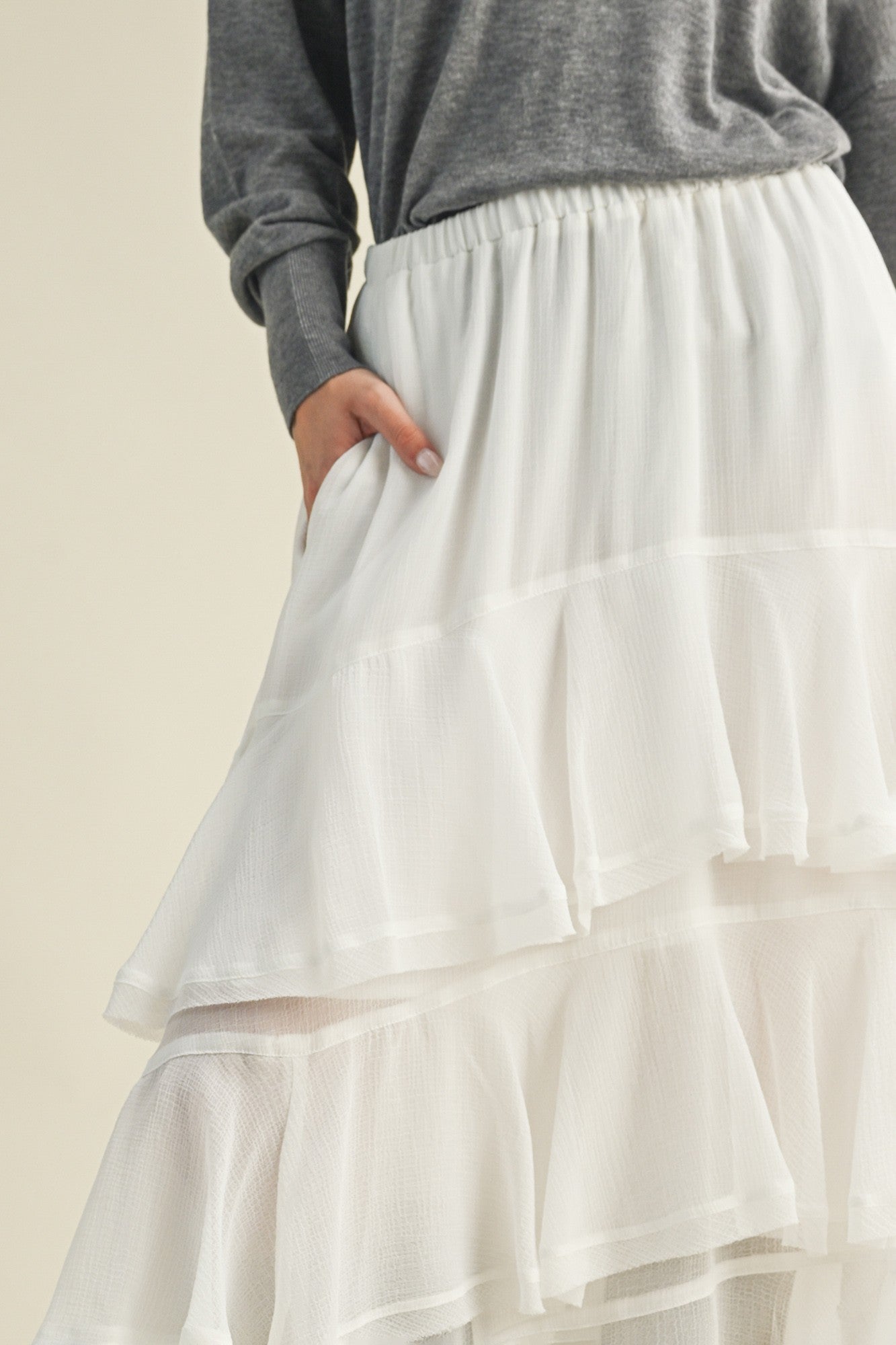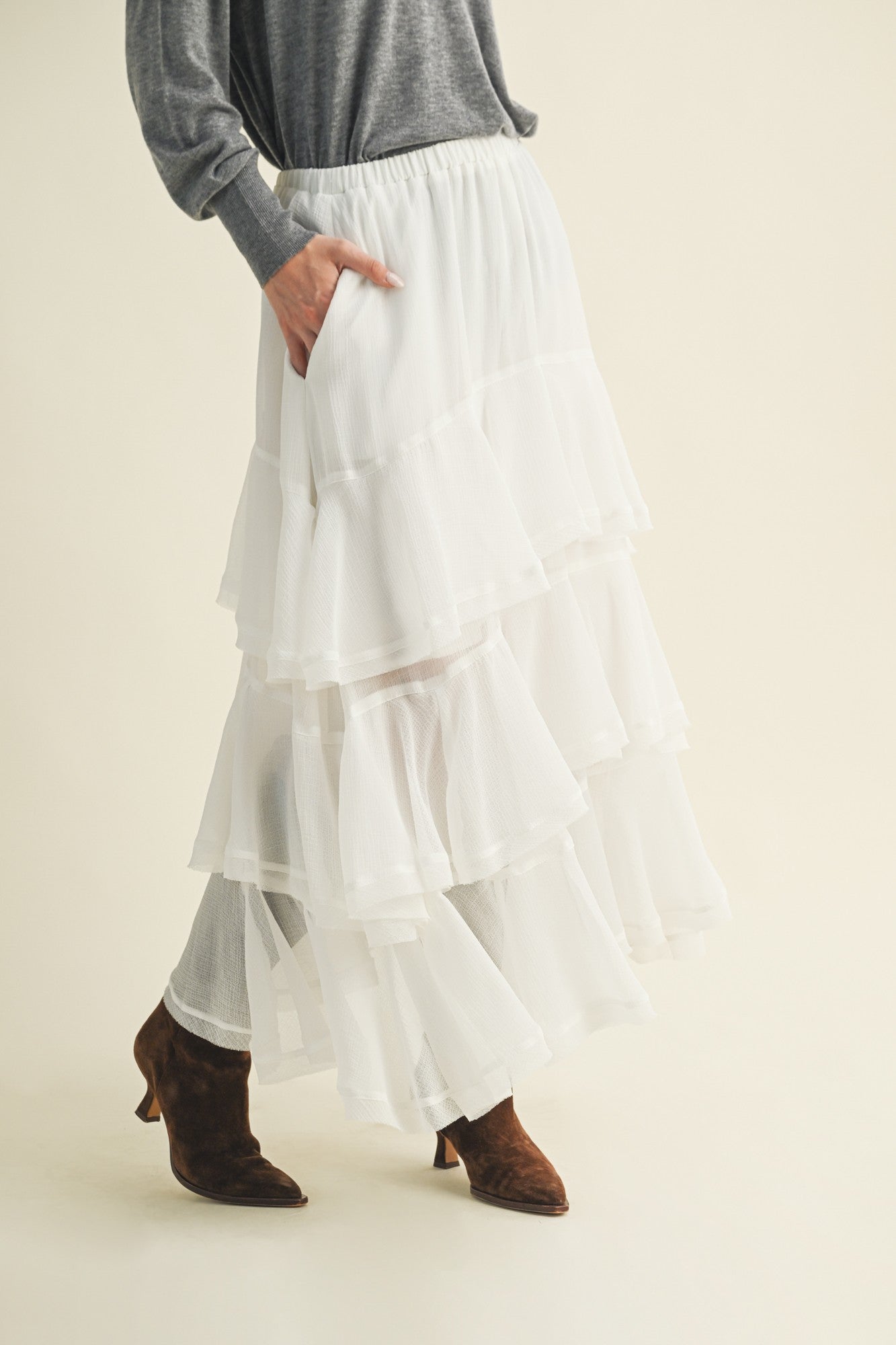 Pull on tiered ruffled maxi skirt. Model is wearing size small.