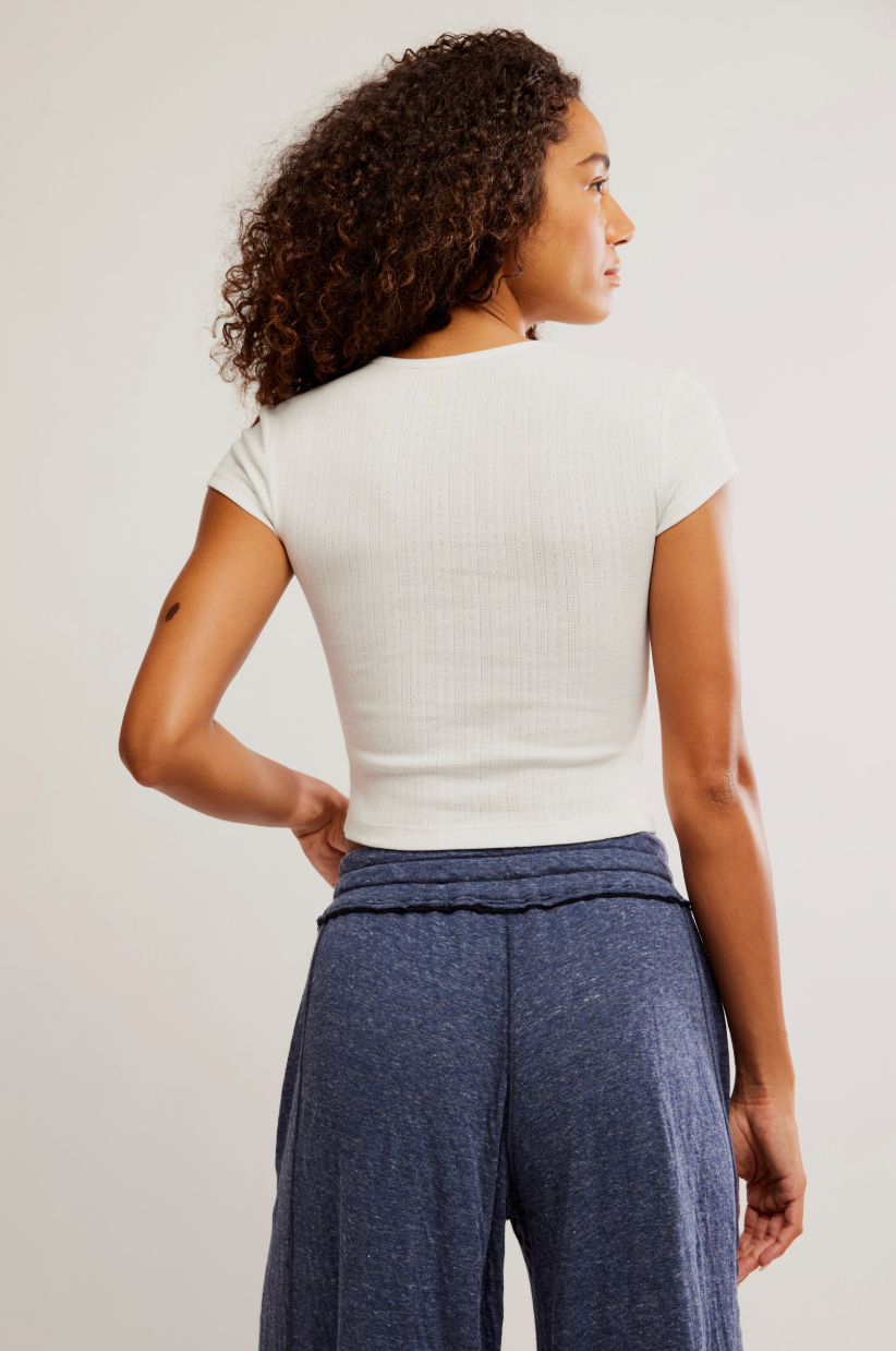 Designed for both comfort and style, this baby tee offers a body-hugging silhouette that moves with you. The soft ribbed cotton blend creates that second-skin feel, while the classic crew neckline and cap sleeves keep it effortlessly cool for every day.