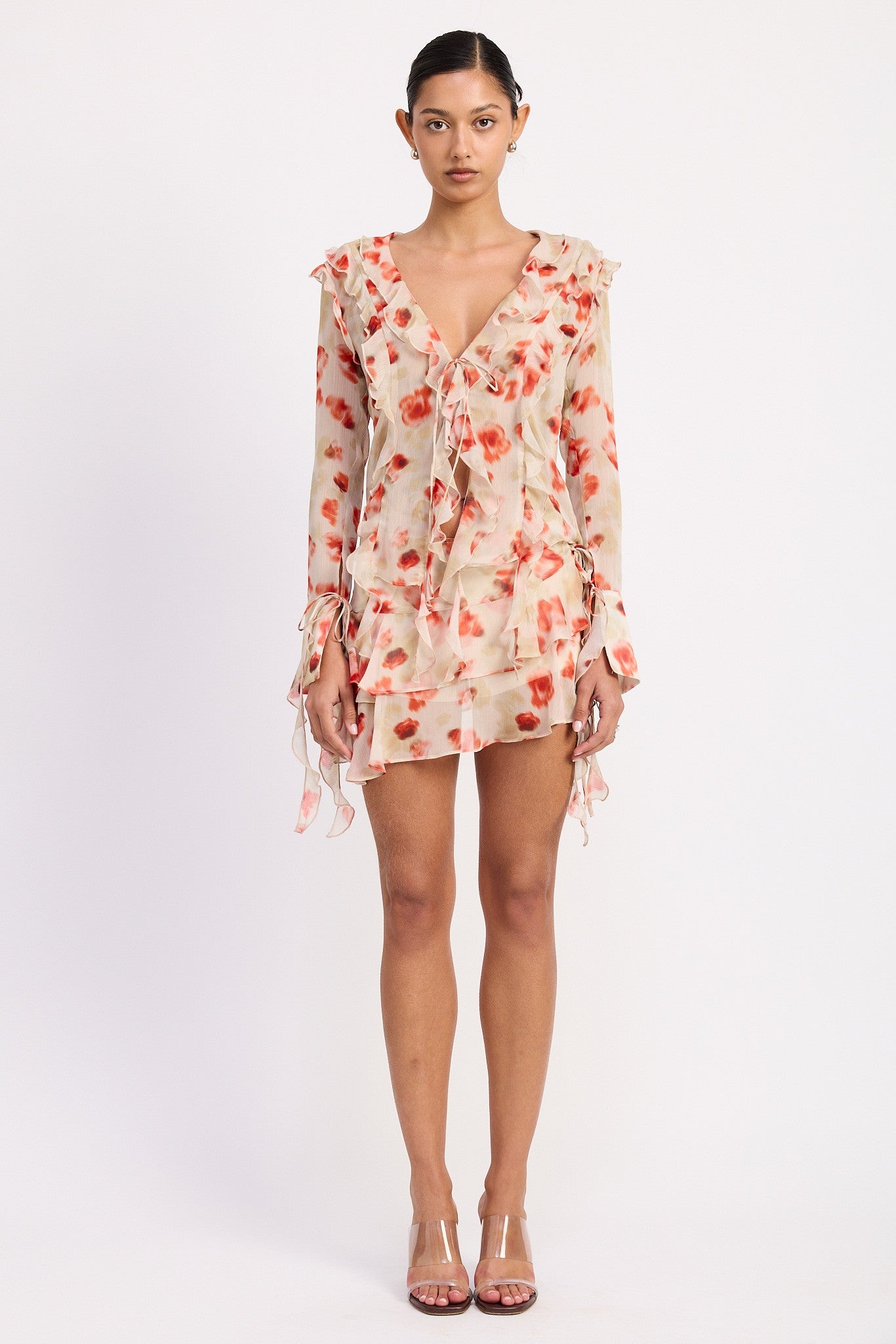 Designed for both comfort and style, this mini skirt features a flattering silhouette that flows effortlessly with every step. The sheer floral-printed polyester layers offer a dreamy, ethereal feel, while the cascading ruffles and side-tie accents bring a romantic touch.
